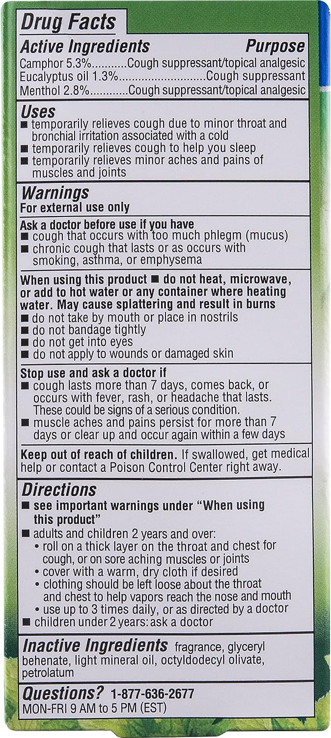 • 100% NATURAL ACTIVE INGREDIENTS – Mentholatum No Mess Vaporizing Rub delivers natural camphor, eucalyptus oil, and menthol in a one-of-a-kind ointment-based formula that provides maximum strength cough relief when applied to the throat and chest. Inhalation of the medicated vapors temporarily relieves cough and is soothing to the nasal passages. Its penetrating formula also helps to relief minor aches and pains of muscle and joints.