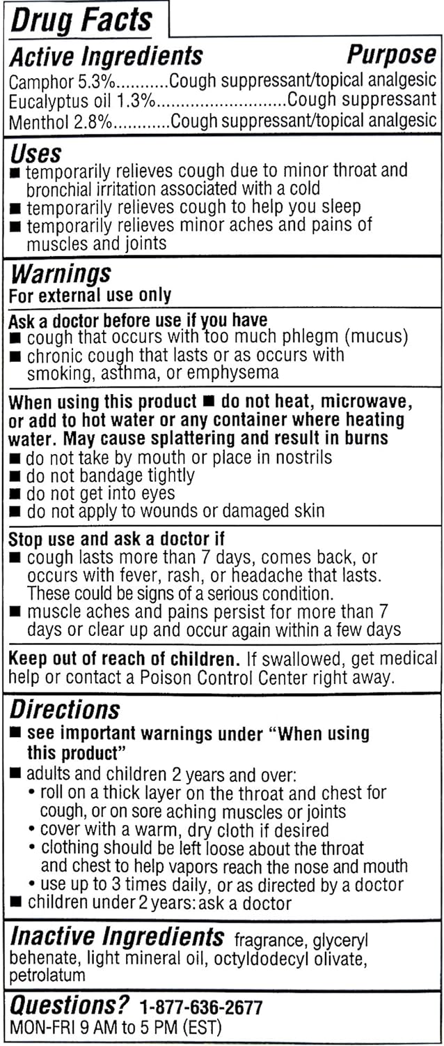 • RELIEVES COUGH TO HELP YOU SLEEP – Cough due to a cold keeping you up at night? Mentholatum No Mess Vaporizing Rub has medicated vapors that temporarily relieves cough to help you or your child sleep – so you can both get the rest you need. Apply to the throat and chest and breathe in the soothing vapors of natural camphor, eucalyptus oil, and menthol – a safe and effective alternative to oral cough medicines.