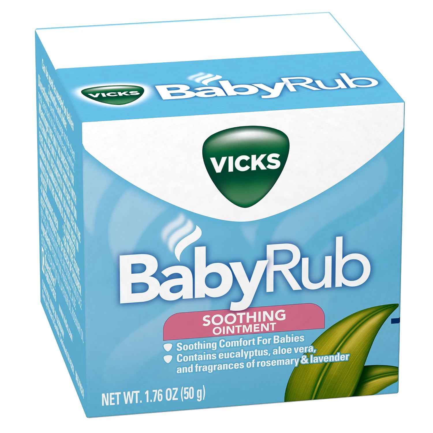 At times when your baby is fussy or irritable you want to do everything you can to soothe and comfort them. The gentle Vicks BabyRub formula contains petrolatum and Aloe to leave your baby's skin feeling soft. Vicks BabyRub contains the aromatic fragrances of Eucalyptus, Rosemary and Lavender. Combined with your loving touch, it is perfect to calm, soothe, and relax your baby.