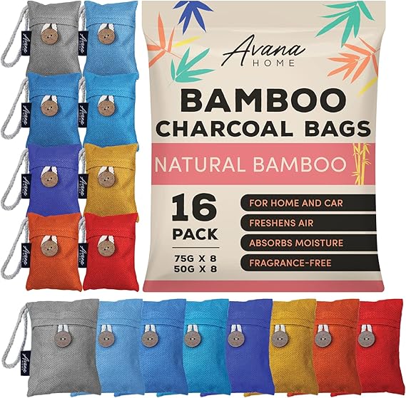 (16 Pack) Bamboo Charcoal Air Purifying Bag - Charcoal Bags Odor Absorber, for Car, Home & Shoes - Activated Charcoal , Fragrance-Free Odor Eliminator (8x75g, 8x50g)
