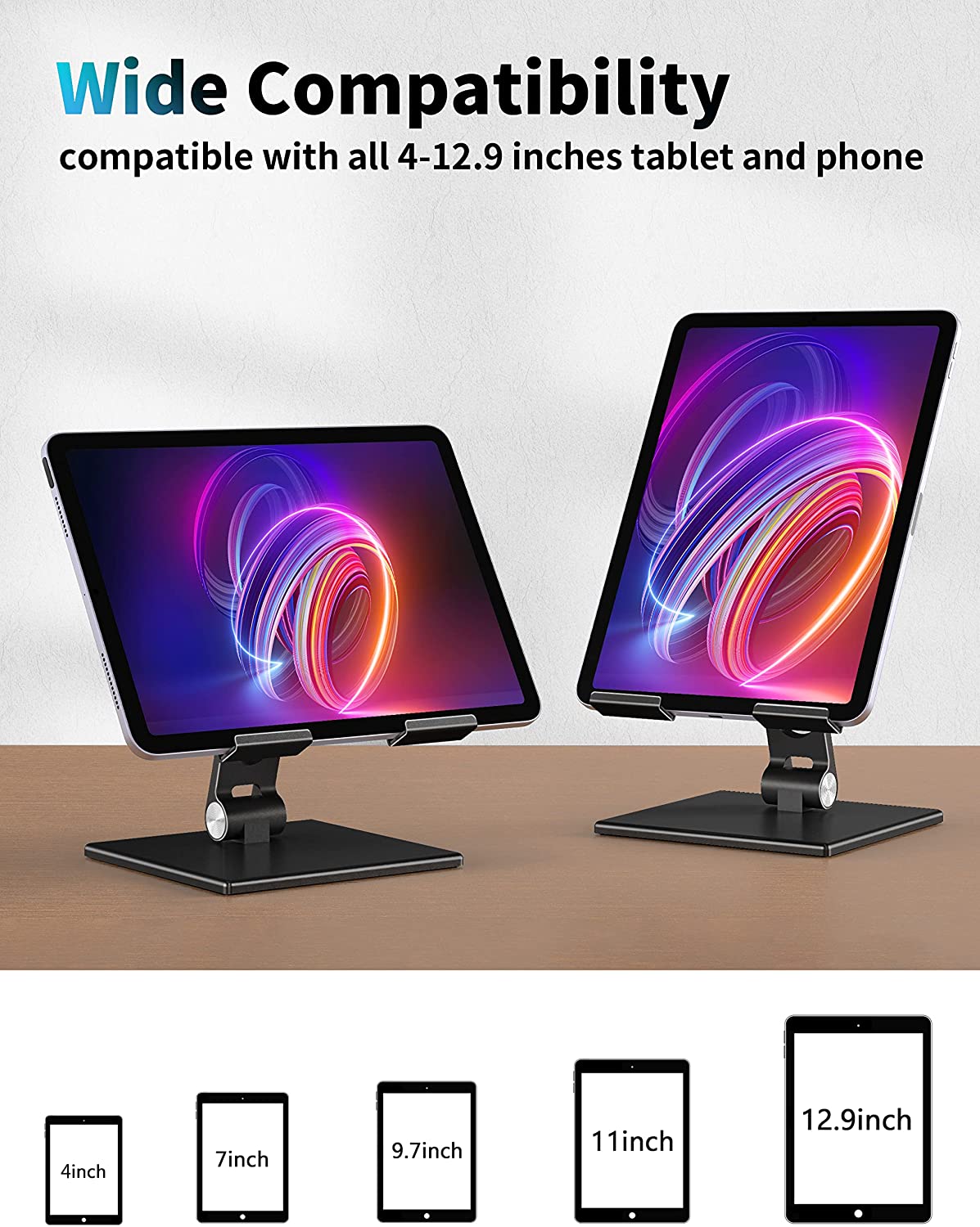 • Thicker Base Make It More Stable – Heavy duty stand made of metal, the thickened base ensures that your tablet is placed firmly, no worry about falling over even hold a big seize tablet. Rubbers covering can protect your devices from scratches.