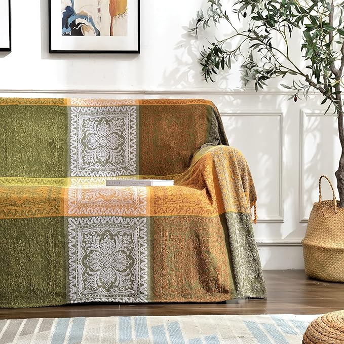 Boho Couch Cover, Bohemian Throw Blanket Tassels Hippie Decor Covers Sofa Chair loveseat Furniture Bed‚_• Bohemian Tribal Fringe slipcover (Green, 60x75)_ã_