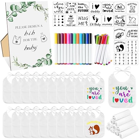 58 Pcs DIY Baby Bibs Decorating Kit Baby Shower Games includes 25 White Bibs 20 Stencils 12 Fabric Markers 1 Baby Shower Game Sign Baby Shower Game Gifts for Boys Girls Gender Reveal Party (Greenery)