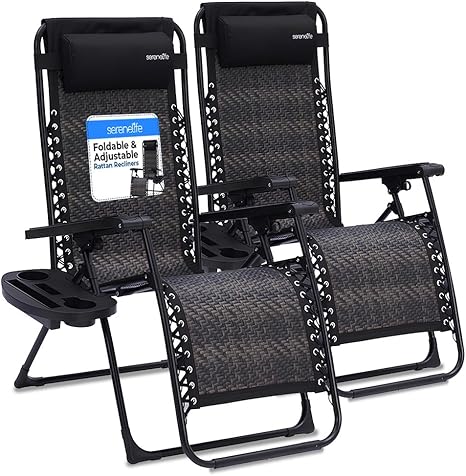 SereneLife Outdoor Rattan Zero Gravity Lawn Chairs, Set of 2 Adjustable Folding Recliners with Cup Holders, Side Table, and Pillow, Weather-Resistant, Durable and Perfect for Outdoor Comfort