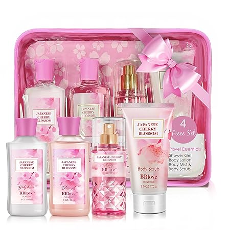 Bath and Body Gift Set for Women & Girls, Japanese Cherry Blossom, 4PCS Set for-Shower Gel, Body Lotion, Body Mist, Exfoliating Scrub, Body Care Set