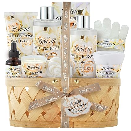 Mothers Day Gifts Bath & Body Spa Gift Basket for Women, Best Gift for Mother's Day & Birthday, White Rose Set Body Lotion, Shower Gel, Bubble Bath, Bath Salt, Towel, Soap, Oil, Candle, Gloves,