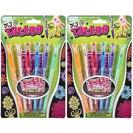 ArtCreativity Shimmery Temporary Tattoo Pens for Kids, 4 Pack, Each Pack with 6 Tattoo Markers & 3 Stencil Stickers, Washable Tattoo Body Ink, Sparkle Girls Fashion Activity, Sparkly Tats Body Art Set