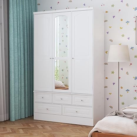 MOUMON 3 Door Wardrobe Closet with Mirror & 5 Drawers, Wardrobe Armoire Closet with Hanging Rod, Armoire Wardrobe with 4 Tier Shelves, Closet for Bedroom White (47.8_‹�W x 19.7_‹�D x 78.7_‹�H)