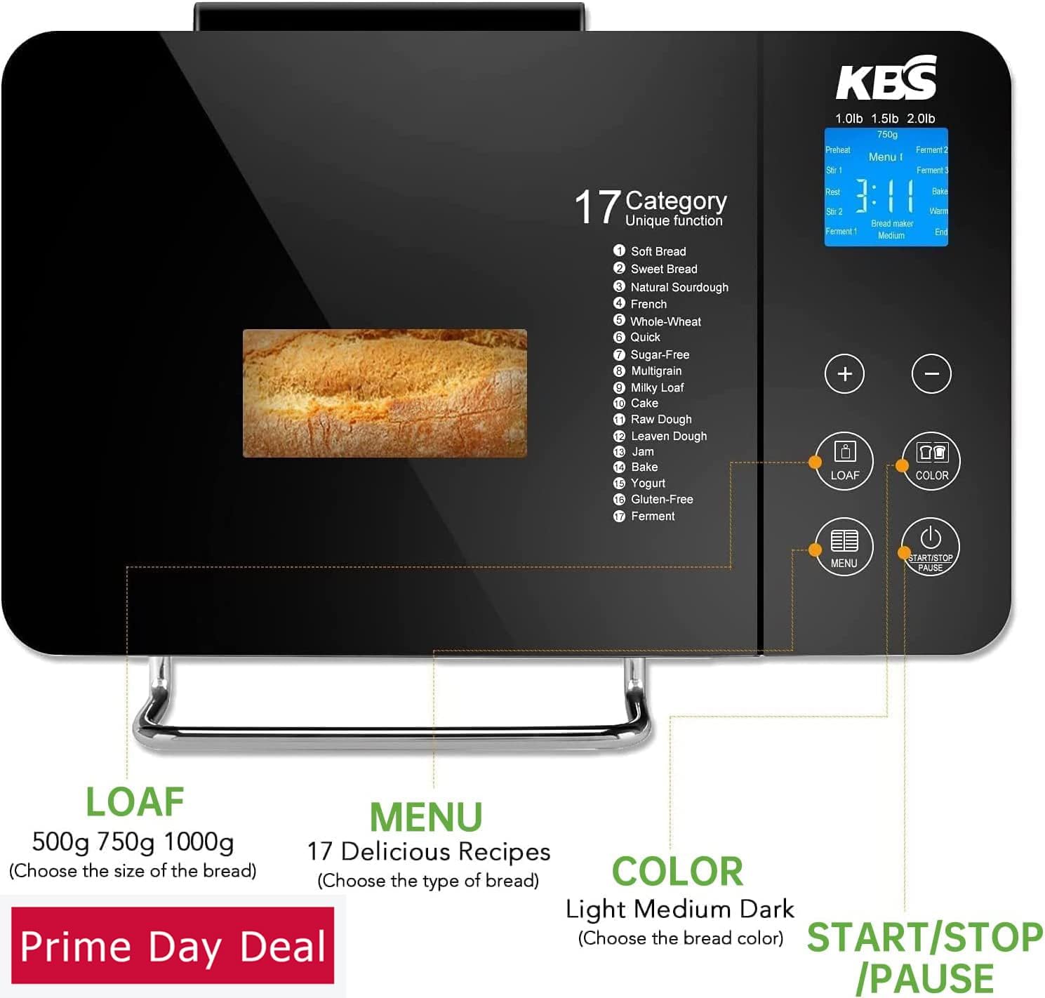 KBS Large 17-in-1 Bread Machine, 2LB All Stainless Steel Bread Maker with Auto Fruit Nut Dispenser, Nonstick Ceramic Pan, Full Touch Panel Tempered Glass, Reserve& Keep Warm Set, Oven Mitt and Recipes