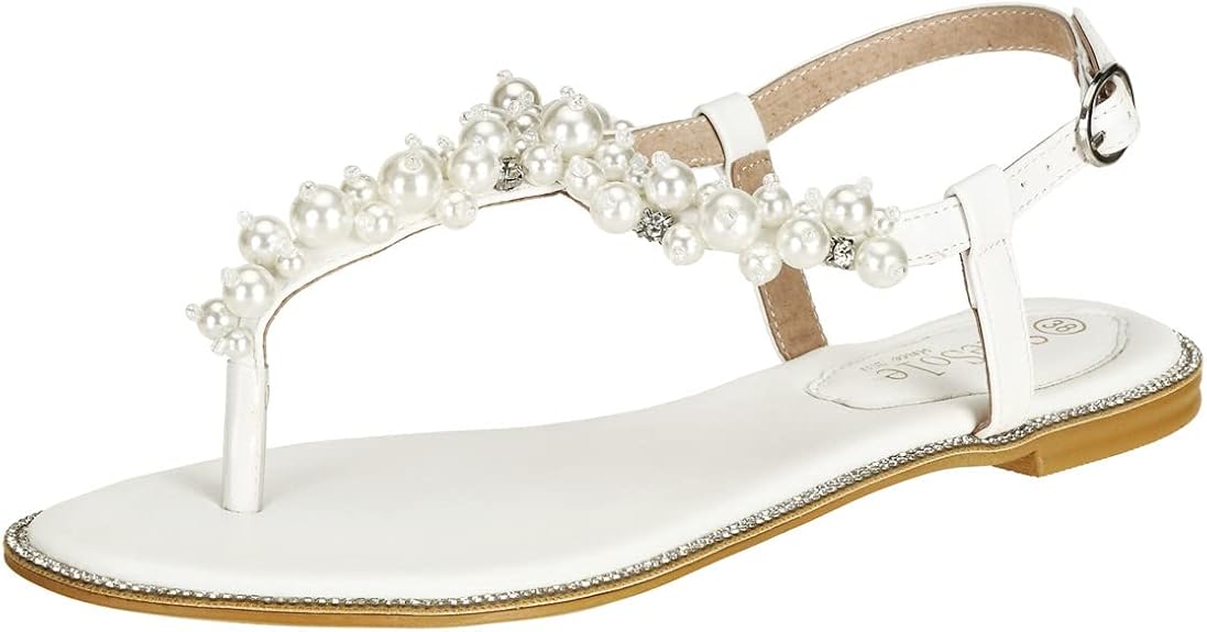 SheSole Women's Pearl Rhinestone Flats Sandals T-Strap Bride Wedding Shoes White