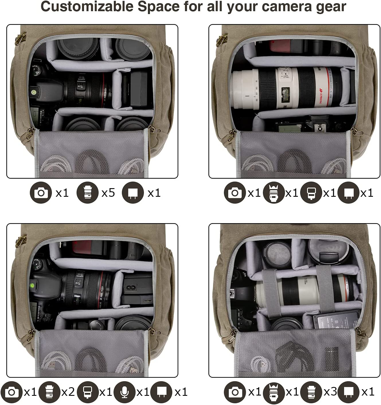 • Large Camera Backpack- Dimensions: 11.8"L x 7.5"W x 15.7"H. The lower padded camera zone is designed for 1 DSLR camera with 70-200mm lens attached, 3-5 standard lenses and accessories. The top storage space is fully reserved for your personal belongings. The thick-padded laptop compartment fits up to 15" laptop