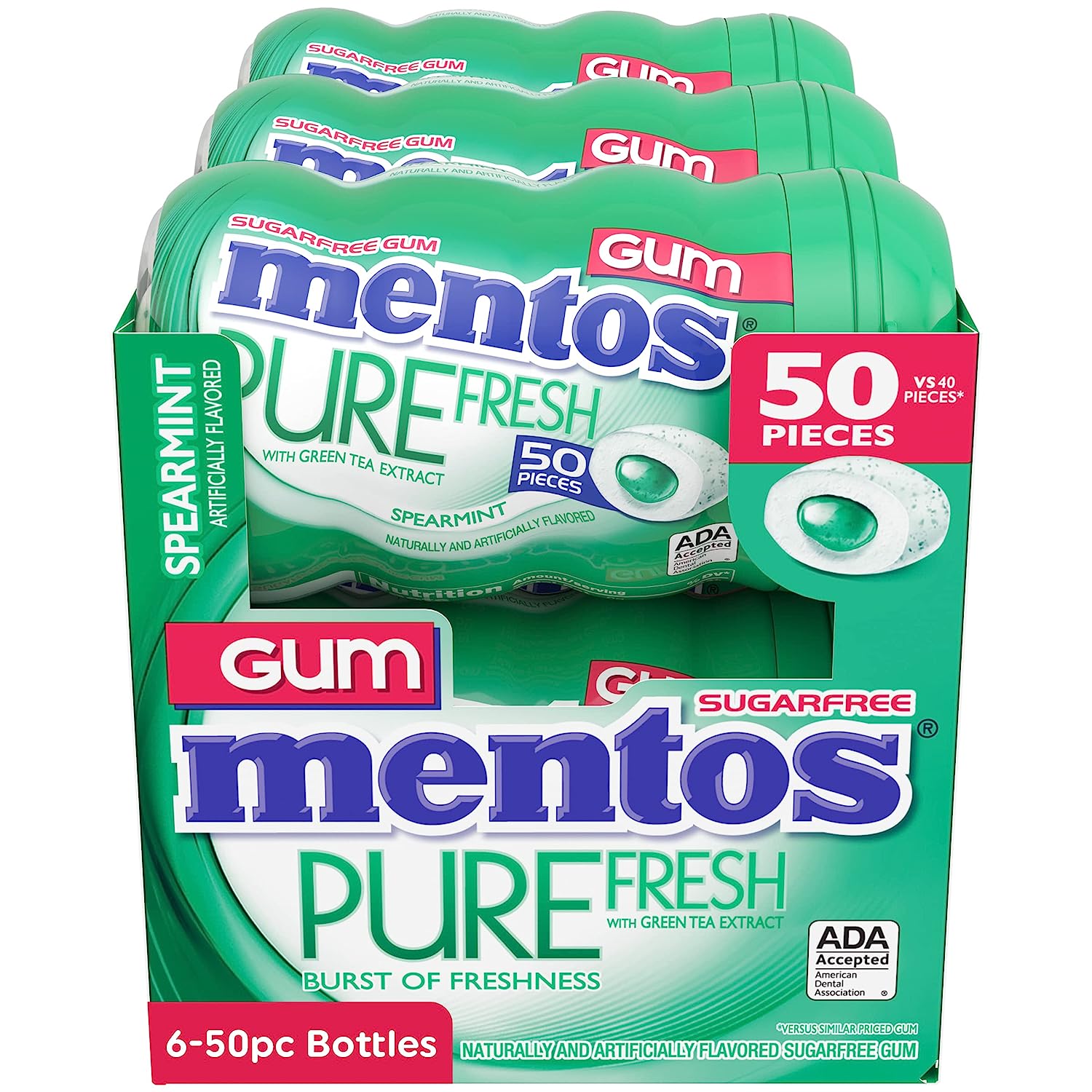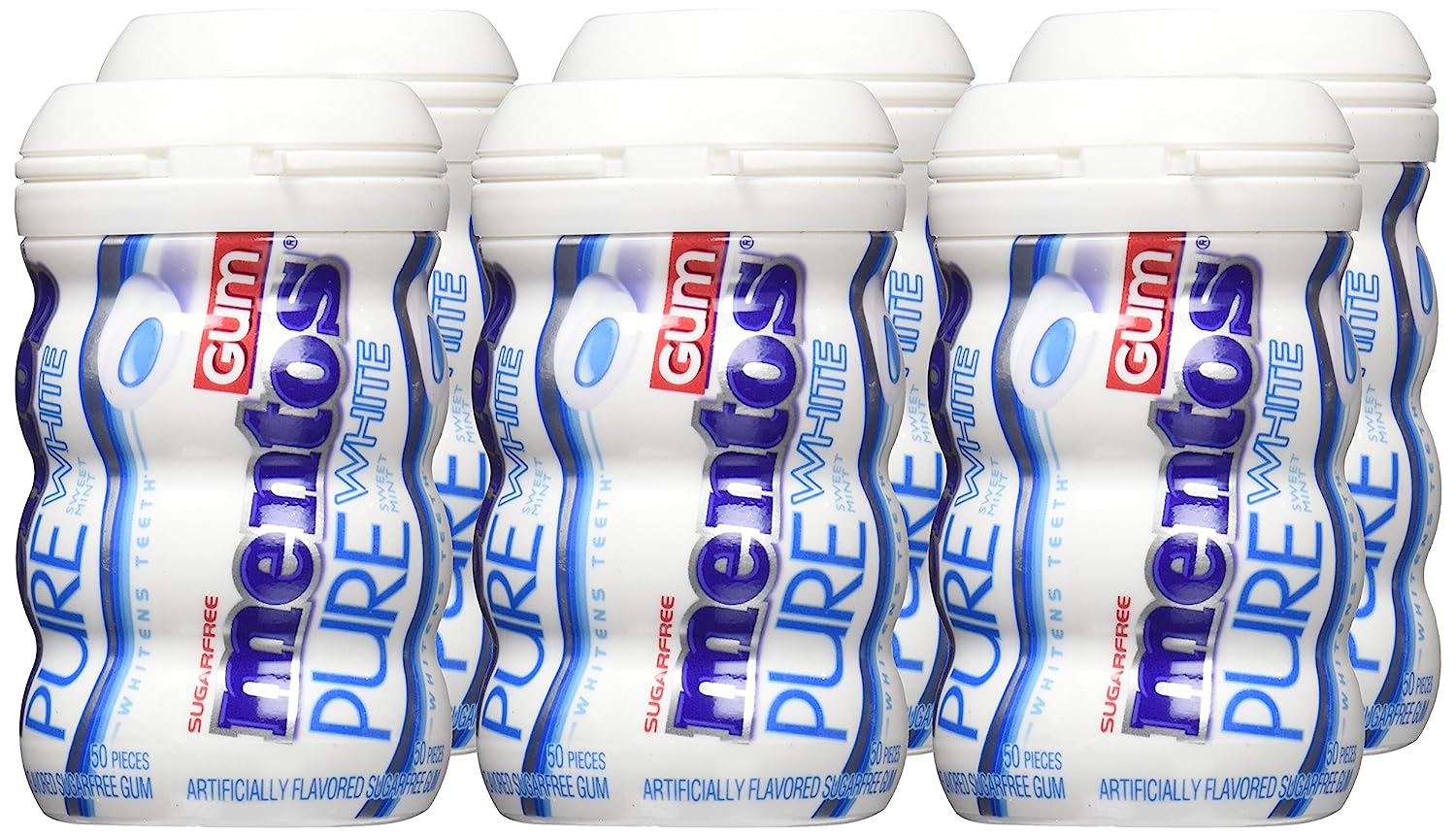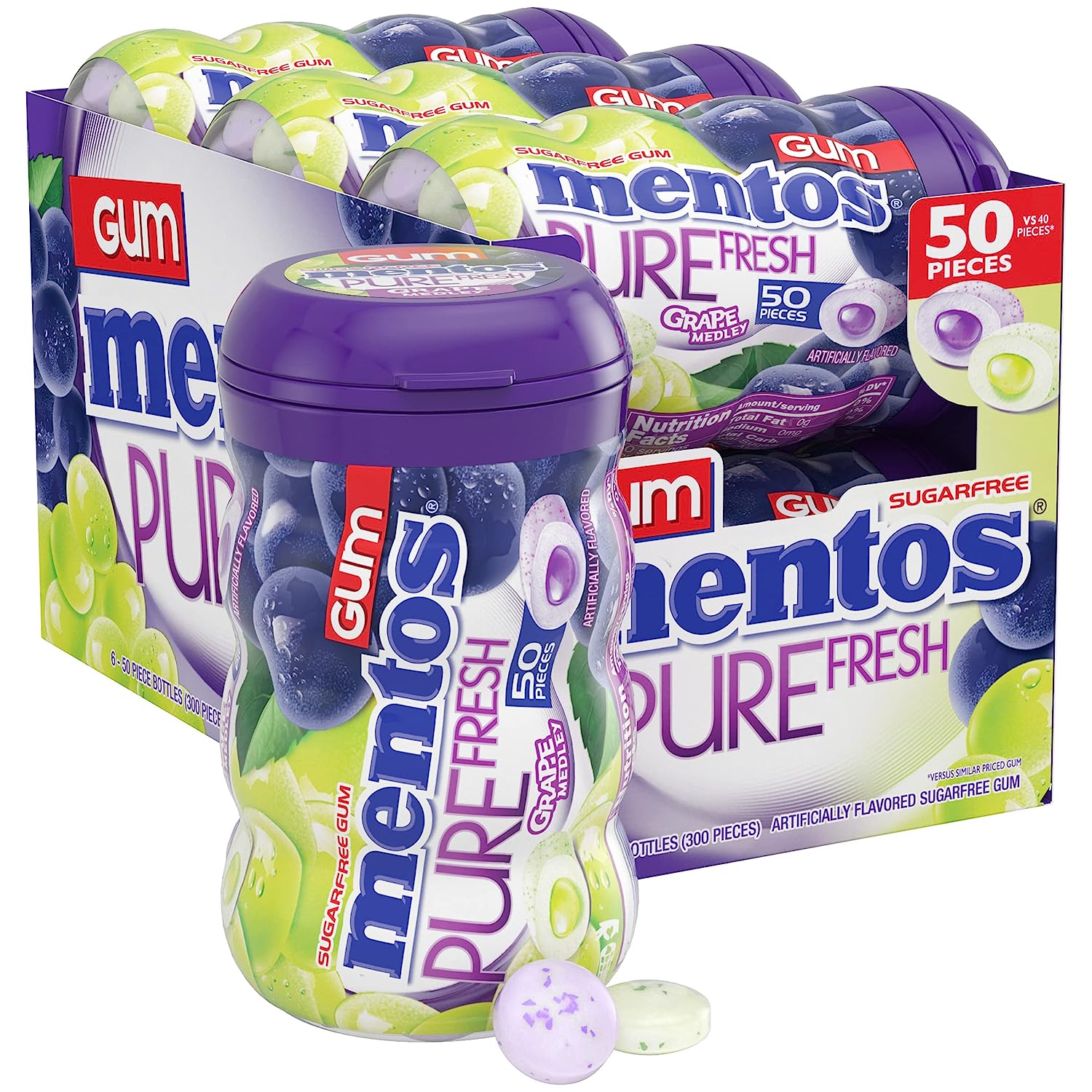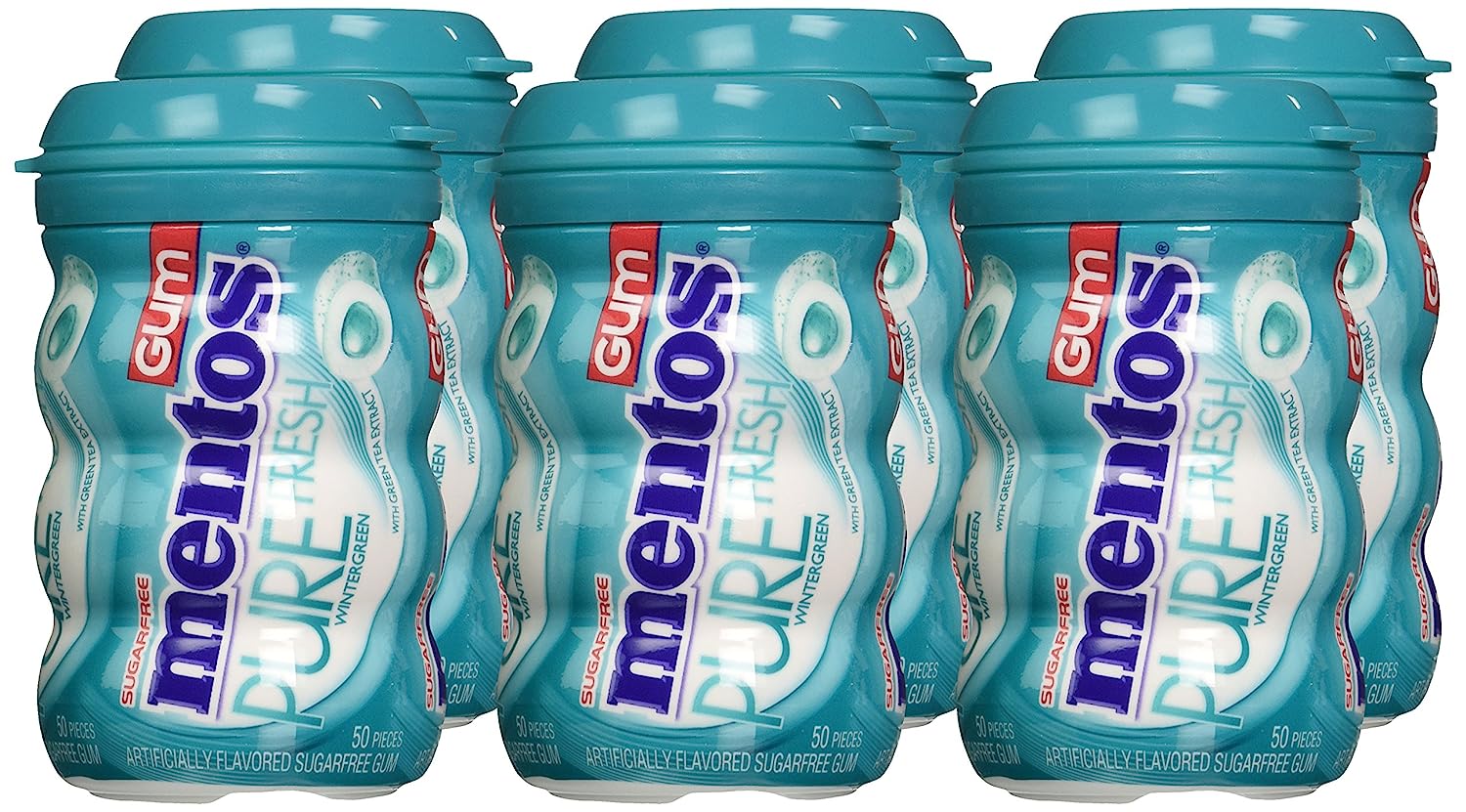 Have a fresh day with Mentos Pure Fresh chewing gum! Bulk gum box includes six 50 piece bottles of Mentos Pure Fresh, Fresh Mint flavored chewing gum. Each piece of this sugar-free, Fresh Mint flavored gum gives you a blast of fresh flavor that lasts chew after chew. Sugar-free for a guilt-free flavor sensation! Chewing gum with xylitol may reduce the risk of tooth decay, and Mentos Pure Fresh chewing gum contains more xylitol than the leading sugar-free chewing gum brand. The Mentos curvy bottle is perfect to keep at your desk, in your car, at home or anywhere you may want some freshness! With 50 pieces per bottle, make fresh connections by sharing or keep all the freshness to yourself. Need to refill your gum stash? Check out Mentos Pure Fresh 120 piece resealable bags in Fresh Mint and Spearmint flavors. Resealable stand-up bulk bag keeps gum fresh and is great to refill your Mentos curvy gum bottles. Mentos Gum is also available in other great flavors: Cinnamon, Watermelon, Grape Medley, Red Fruit Lime, Bubble Fresh, Spearmint, Wintergreen and Sweet Mint.