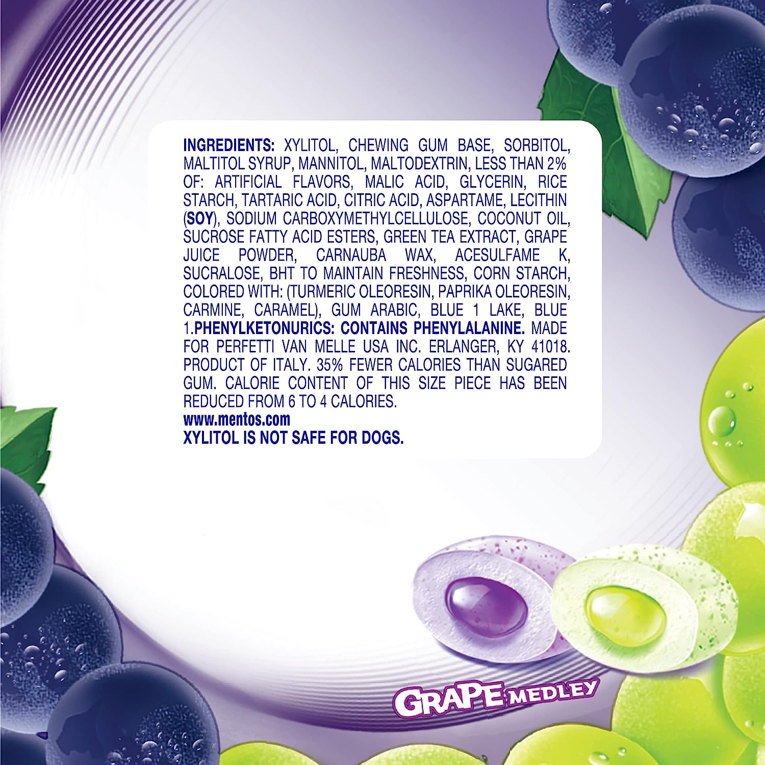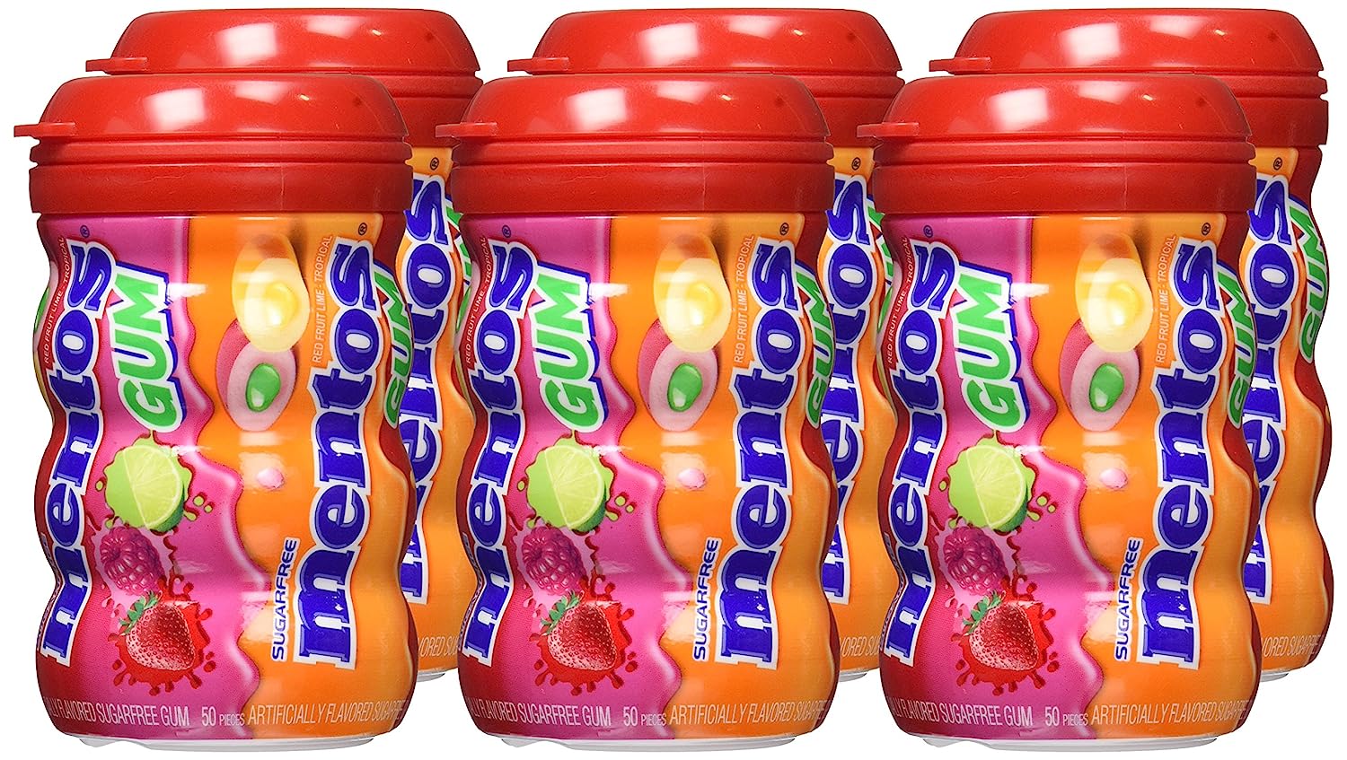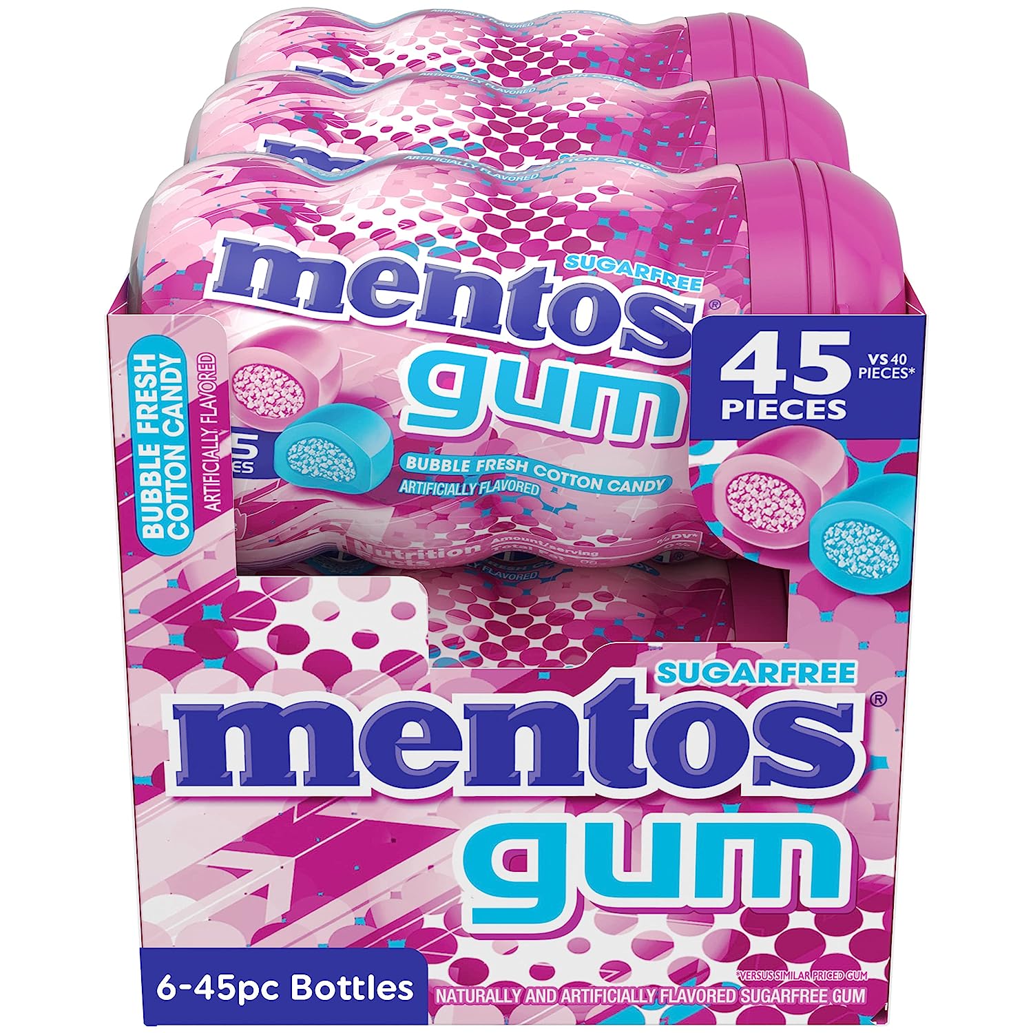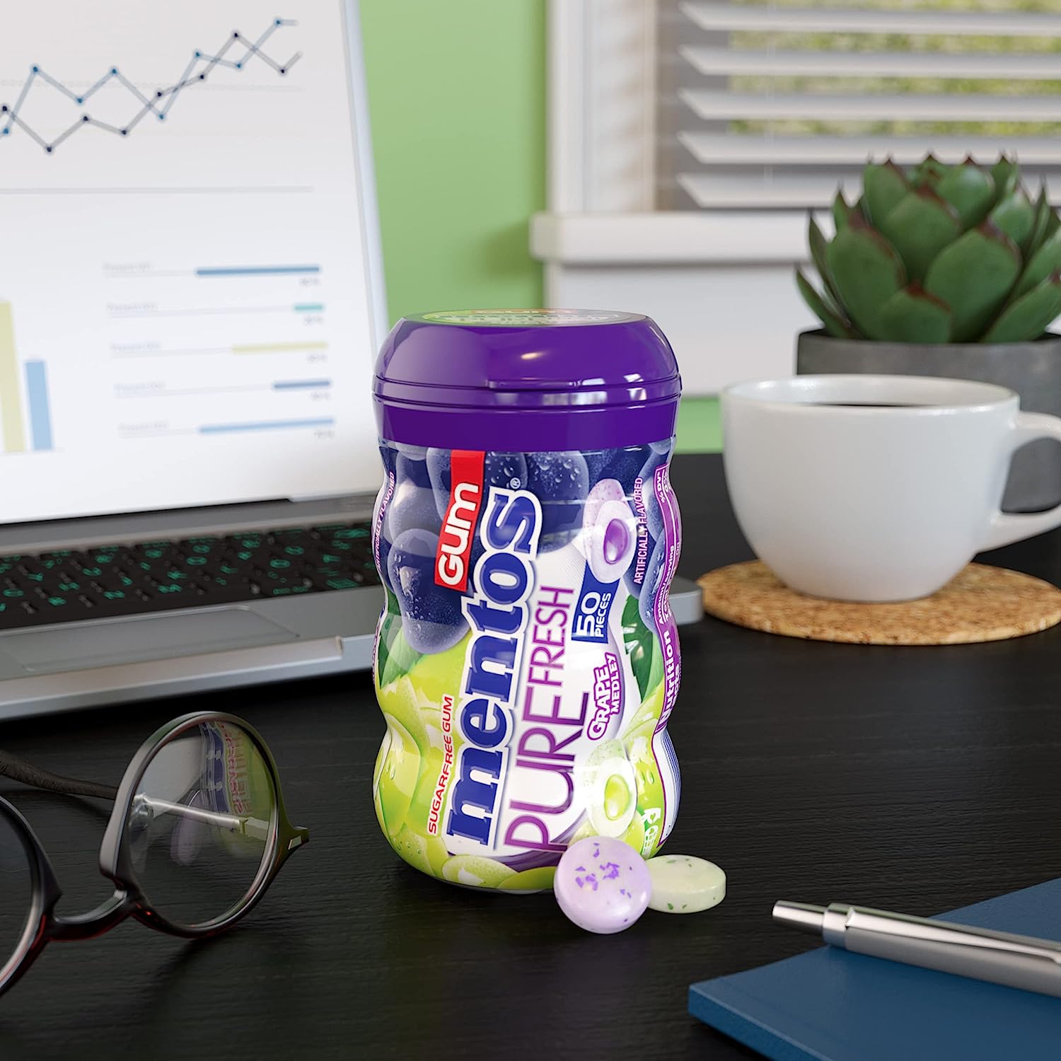 Have a fresh day with Mentos Pure Fresh chewing gum! Bulk gum box includes six 50 piece bottles of Mentos Pure Fresh, Fresh Mint flavored chewing gum. Each piece of this sugar-free, Fresh Mint flavored gum gives you a blast of fresh flavor that lasts chew after chew. Sugar-free for a guilt-free flavor sensation! Chewing gum with xylitol may reduce the risk of tooth decay, and Mentos Pure Fresh chewing gum contains more xylitol than the leading sugar-free chewing gum brand. The Mentos curvy bottle is perfect to keep at your desk, in your car, at home or anywhere you may want some freshness! With 50 pieces per bottle, make fresh connections by sharing or keep all the freshness to yourself. Need to refill your gum stash? Check out Mentos Pure Fresh 120 piece resealable bags in Fresh Mint and Spearmint flavors. Resealable stand-up bulk bag keeps gum fresh and is great to refill your Mentos curvy gum bottles. Mentos Gum is also available in other great flavors: Cinnamon, Watermelon, Grape Medley, Red Fruit Lime, Bubble Fresh, Spearmint, Wintergreen and Sweet Mint.
