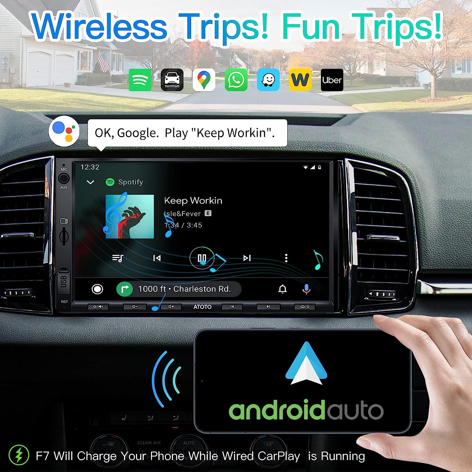 • 【Wireless CarPlay】F7 WE Double DIN head unit offers wired and wireless CarPlay. You can get directions from navigation apps like Waze, put on your personal playlist on Spotify, have Siri call a friend, etc. without even taking your iPhone out. Really convenient, not to mention safe. What a carefree driving experience! ATOTO proudly informs you that F7 car radio charges iPhone quickly while using wired CarPlay and supports running navigation in CarPlay while listening to FM/AM radio or USB music.