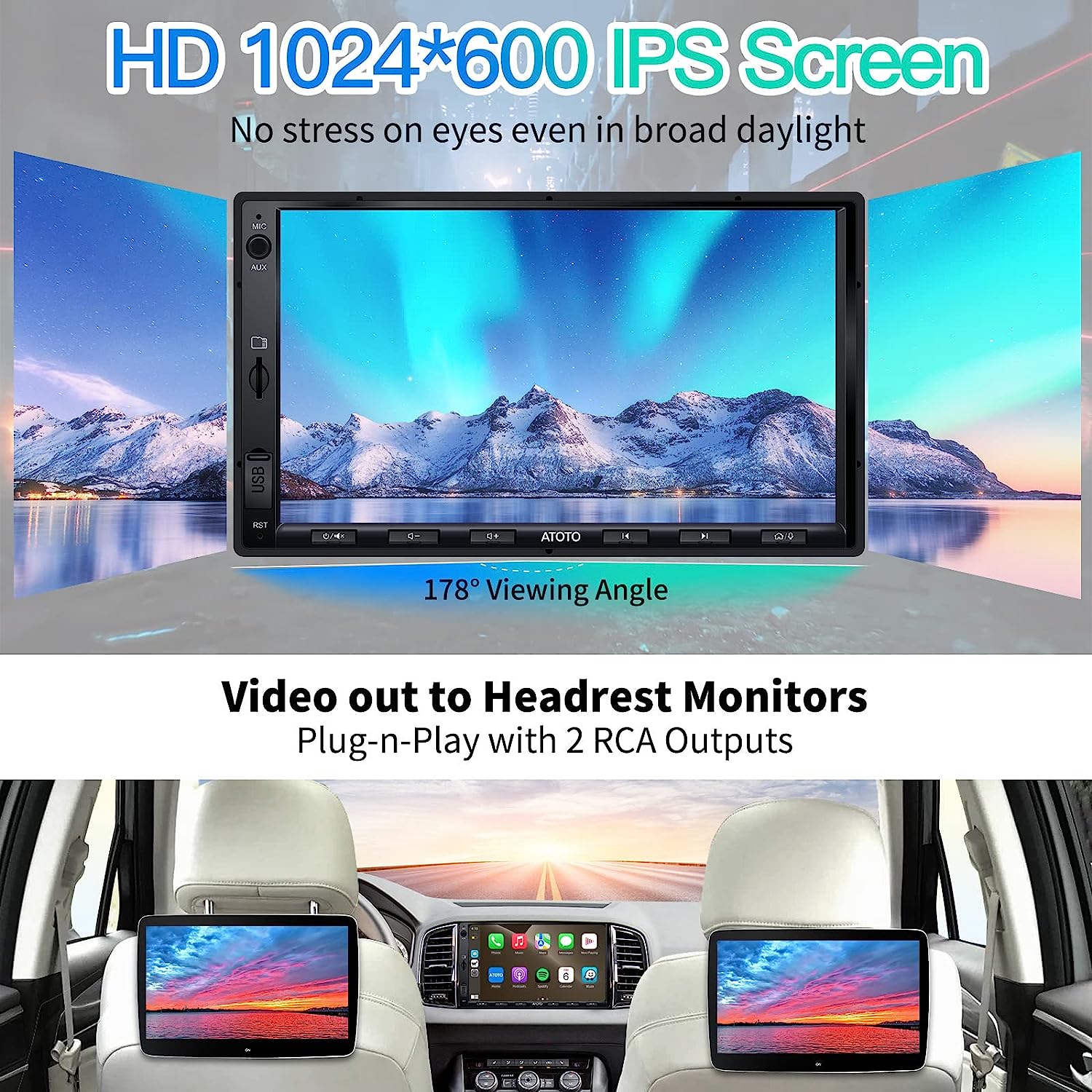 • 【IPS HD screen, Mirrorlink】IPS 1024*600 screen offers ATOTO's classic outstanding brightness. Never worry about not seeing clear navigation cues in the sun. With Mirrorlink, you can cast your phone's display to F7's car stereo have amazing screen, complementing CarPlay/Android Auto. Also play local media files and output to headrest monitors via 2 video out RCA jacks on the back. Reads external storage up to 2TB SSD and 512 GB SD card, ensuring enough space for videos and songs.