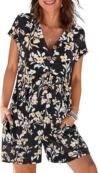 MEROKEETY Women's Summer Cap Sleeve Jumpsuits 2025 Casual V Neck Button Short Romper with Pockets