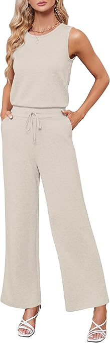 Sarin Mathews Air Essentials Jumpsuits for Women Casual Wide Leg Long Pants Jumpsuit Sleeveless Belted Rompers with Pockets