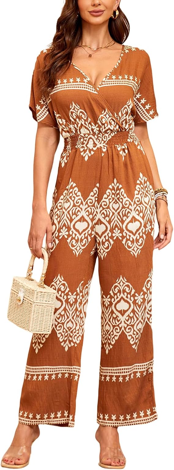 Women's Floral Jumpsuit Boho Jumpsuit Floating Short Sleeve V-Neck Elasticized Drawstring Jumpsuit with Pockets