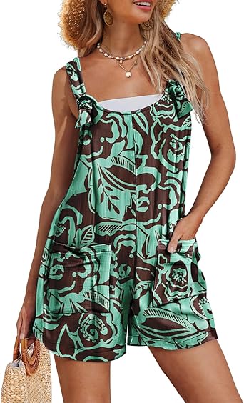 YESNO Women's Summer Casual Rompers Boho Floral Short Overalls Adjustable Tie Knot Straps Loose Jumpsuits with Pockets PHY