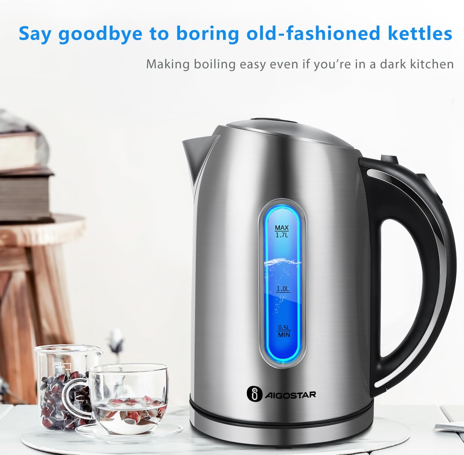 Aigostar Electric Kettle, 1.7L Electric Tea Kettle Stainless Steel, Hot Water Kettle Electric BPA Free, Fast Boiling Water Kettle with LED Light, Auto-Shutoff & Boil-Dry Protection, Inner Tea Filter