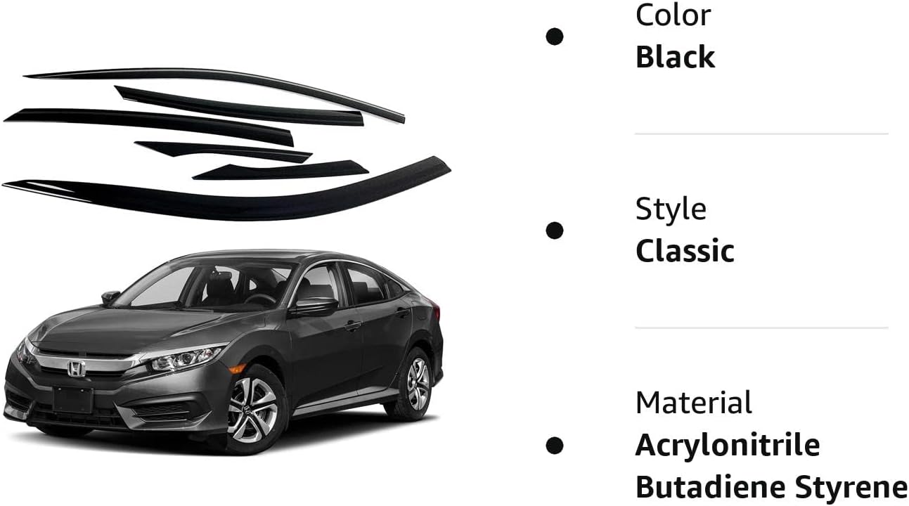 AUTOCLOVER Black Side Window Visor 6 Piece Set for Honda Civic 4dr 2016 2017 2018 2019 2020 2021 / Safe RAIN Out-Channel Guard Deflector