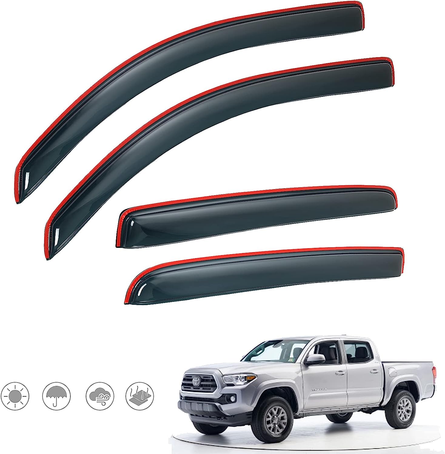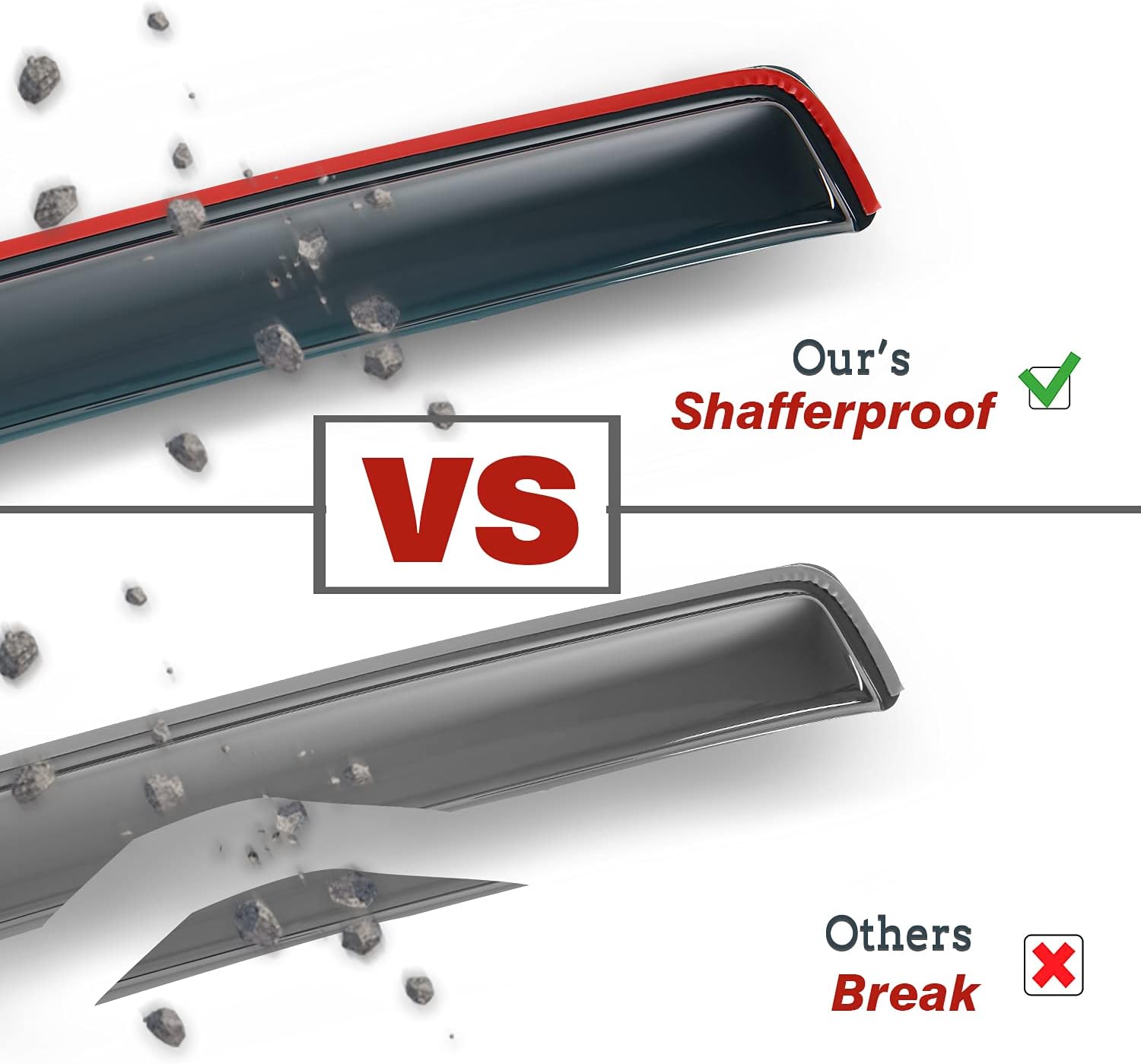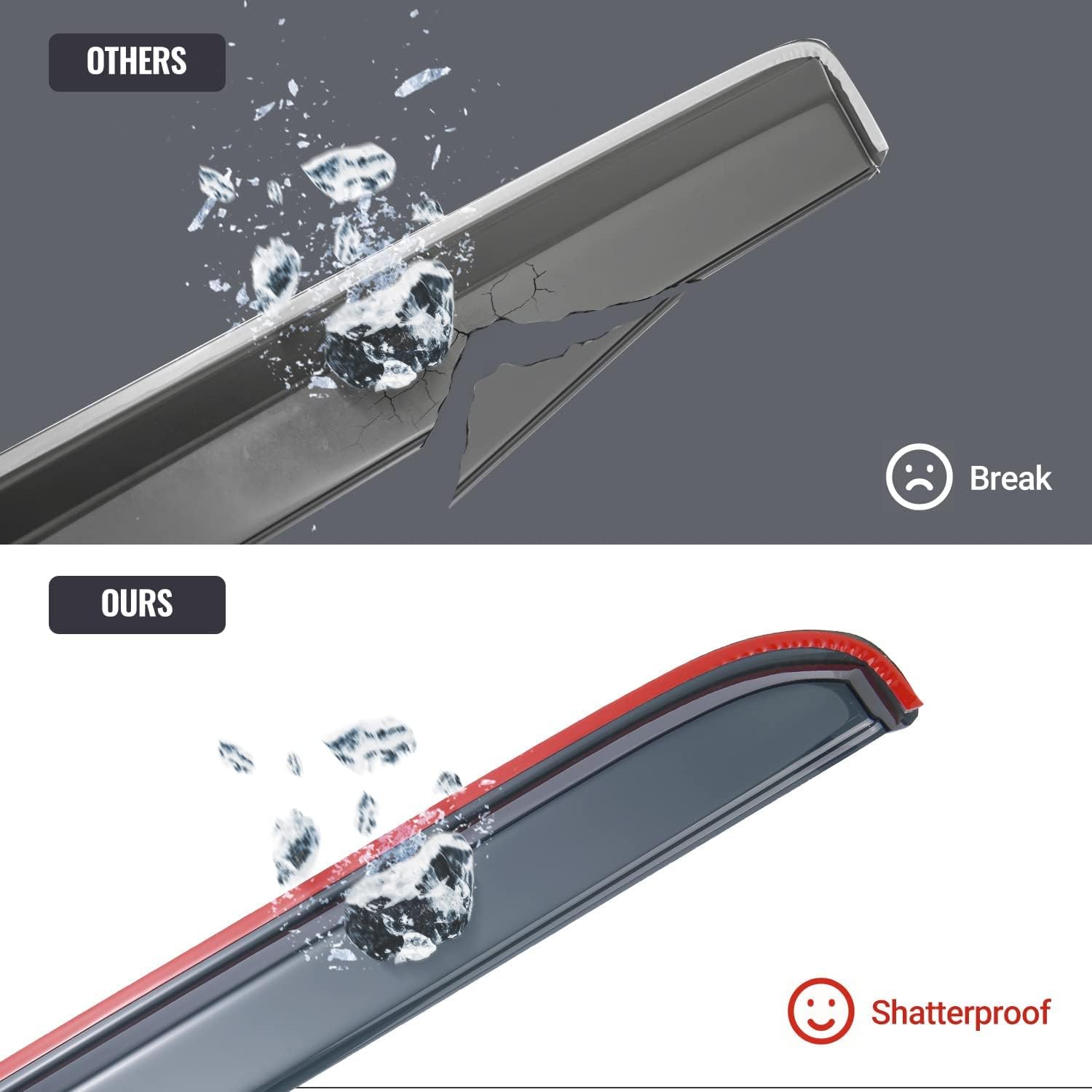 • SHATTERPROOF & EXCELLENT TENACITY - Vent Window Visor Made with Tough and Shatterproof Premium-quality Acrylic, Will Not Bend, Break or Crack. Our Rain Guards Feature a Streamlined Flexible Design, and Use Genuine Certified Adhesive Tape, to Make Sure It Doesn't Fall off on the Highway.