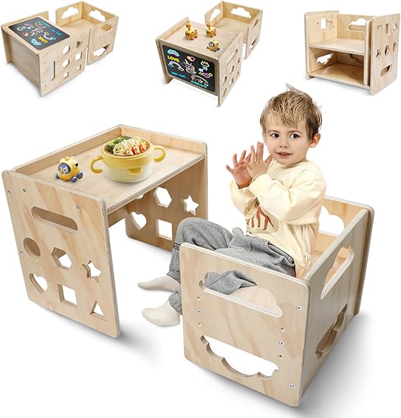 Montessori Weaning Table and Chair Set, Wooden Toddler Table and Chair Set Kids Activity Table Step Stools with Blackboard & 3 Heights Adjustable, 1-3 Age Kids Funiture for Eating Drawing Reading