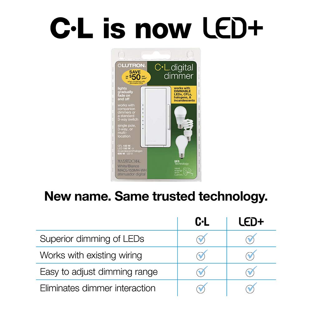The Maestro LED+ dimmer switch provides optimal dimming performance of LED bulbs. This dimmer switch works with up to 150-Watt of dimmable LED/CFL or 600-Watt of incandescent/halogen, allowing you to control multiple bulb types on the same circuit. It is designed to control a broad range of dimmable LED and CFL bulbs from a variety of brands including Philips, Cree, GE, EcoSmart and Lighting Science. Use the rocker to adjust the light level for any activity or set the preset level to ensure lights always turn on to your desired light level. Advanced features include delayed fade to off, which allows time to exit a room or to get into bed before the lights turn off. Coordinating Claro wall plate sold separately.