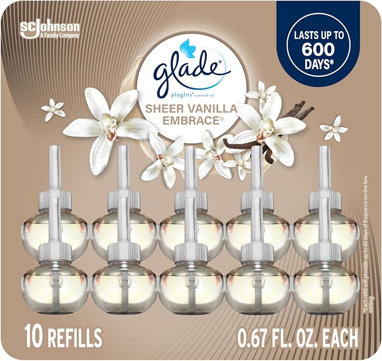 Glade PlugIns Refills Air Freshener, Sheer Vanilla Embrace, Scented and Essential Oils for Home and Bathroom, 0.67 Fl Oz, 10 Count