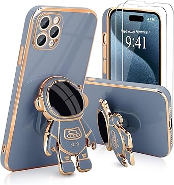 for iPhone 15 Pro Max Case, Cute 3D Astronaut Stand with [2 Screen Protector] [Camera Protection] Kickstand Shockproof Silicone Soft Cover for Apple iPhone 15 Pro Max Phone Case, Blue