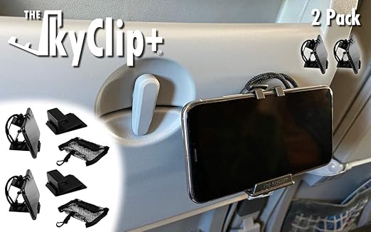 The SkyClip+ Phone & Tablet Holder for Air Travel, Home and Office Use - Inflight Phone Mount & Stand Compatible with iPhone, Android, Kindle and Tablets - Travel Accessory (Black & Black, 2 Pack)