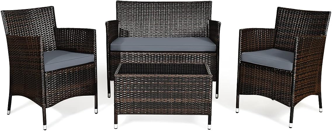Goplus 4-Piece Rattan Patio Set, Outdoor/Indoor Wicker Conversation Set for Pool, Backyard, Lawn, Wicker Chairs and Sofa with Soft Cushion, Rattan Furniture with Tempered Glass Coffee Table