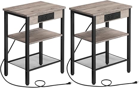 HOOBRO End Tables Set of 2 with Charging Station and USB Ports, 3-Tier Nightstands with Adjustable Shelves, Small Side Tables for Small Space in Living Room, Bedroom and Balcony, Greige BG112BZP201