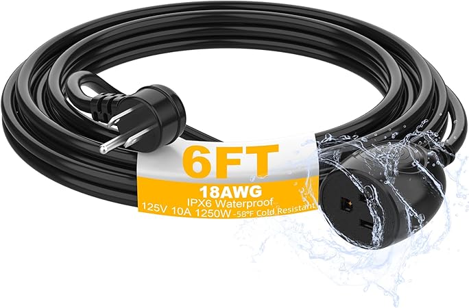 6FT Waterproof Outdoor Extension Cord, IPX6 Waterproof, Cold Weather & Fireproof, Heavy Duty 3 Prong Cable, 18AWG 125V 10A, FCC/ETL Certified