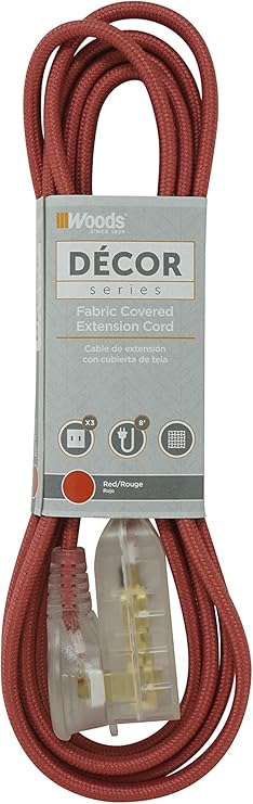 Woods 64600701 Decor Series 8-Foot Fabric Braided Indoor Extension Cord with Lighted Ends; 3 Polarized 2-Prong Outlets; Right Angle Plug; 125 Volts; Red