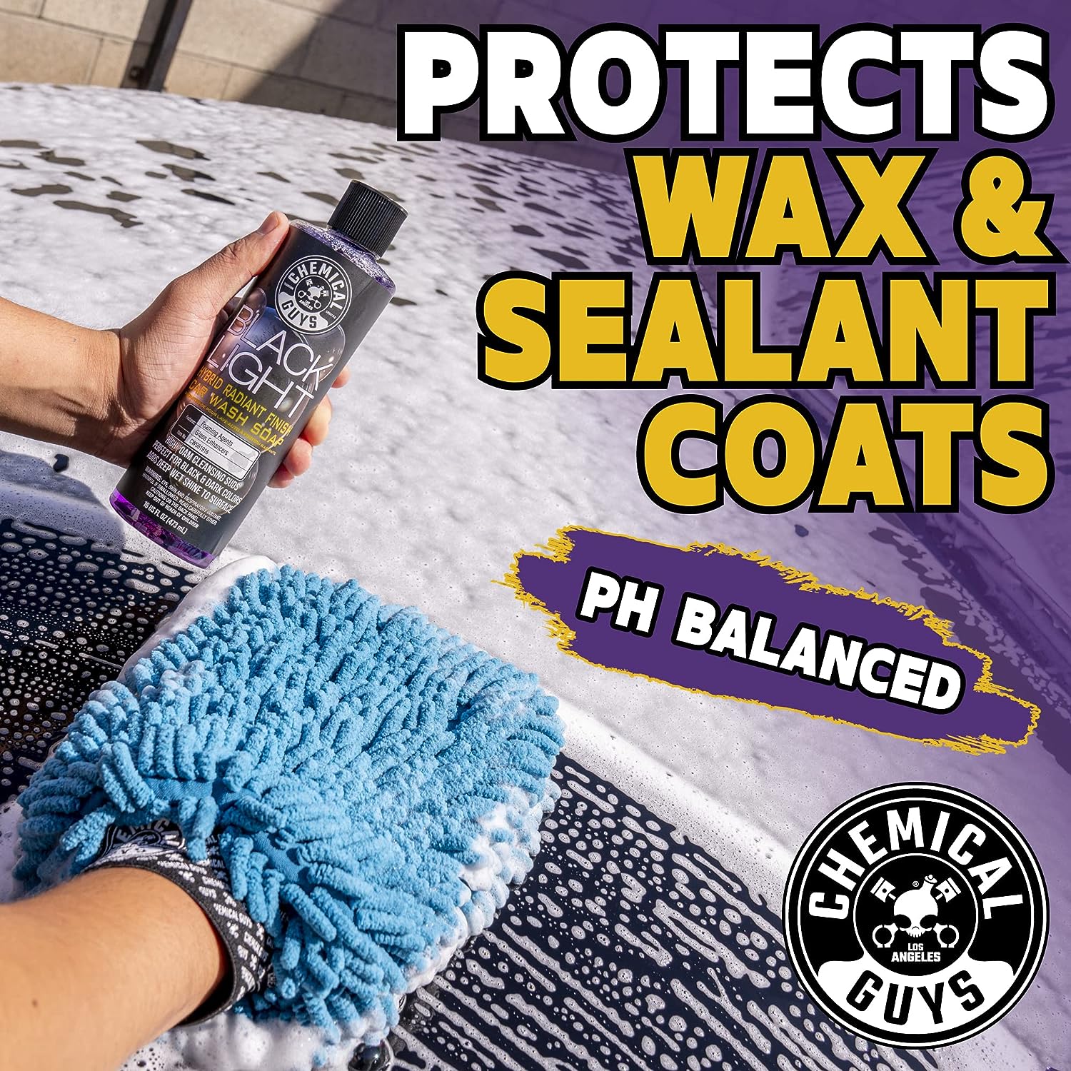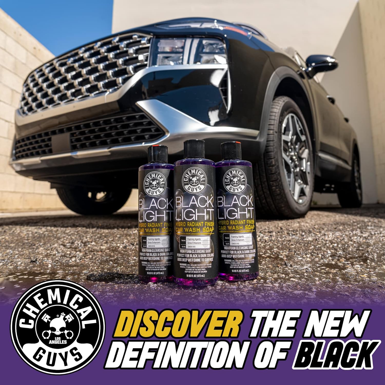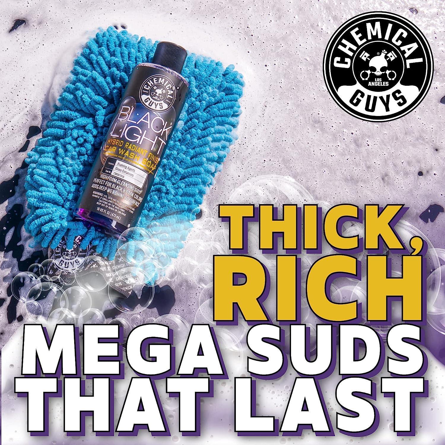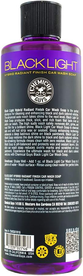 Black Light Car Wash Soap is the perfect shampoo for cleaning and enhancing black and dark colored vehicles. The advanced auto wash takes shine to new levels of depth and clarity. Black Light Car Wash Soap produces thick, slick, and rich foam that lasts through an entire car wash. The super high suds wash safely removes dirt, grime, and road film for a brilliant shine. Black Light Car Wash Soap is clear coat safe and will not strip wax or sealant. Gloss technology agents enhance a deep lustrous shine on black and dark color paint finishes. Use Black Light Car Wash Soap in any foam gun or foam cannon for added soapy suds along with the traditional two bucket car wash method. When used in a foam cannon, Black Light Soap produces thick foamy suds that cling to automotive surfaces and help release dirt and grime for a gentle scratch-free wash.