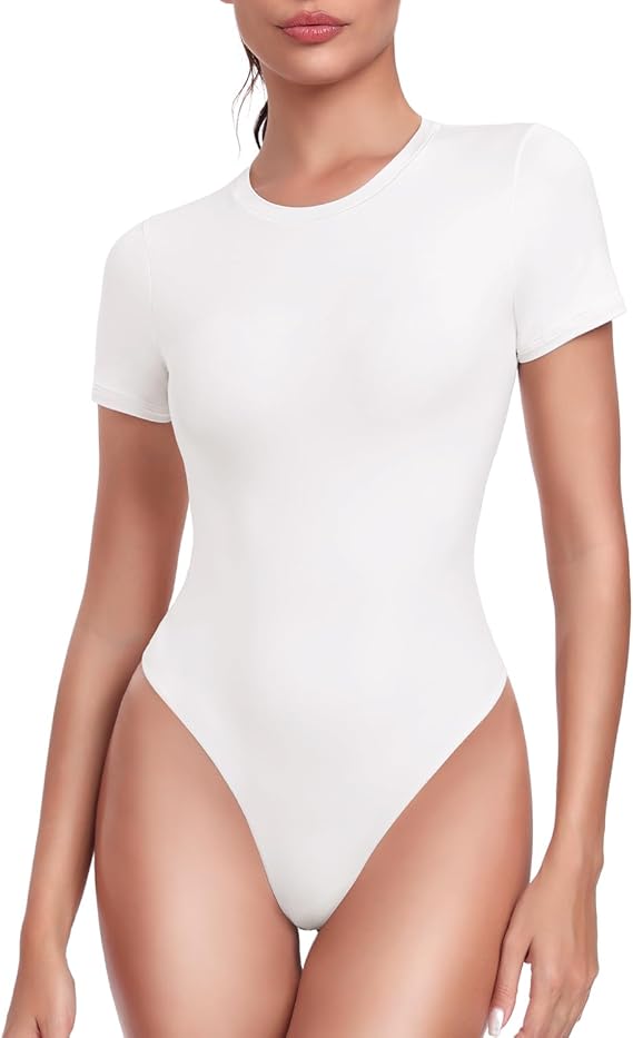 HeyNuts Women's Double Layer Ultra Soft Short Sleeve Crew Neck Thong Back/Brief Back T-Shirts Bodysuit, Causal Tops Basic Tee
