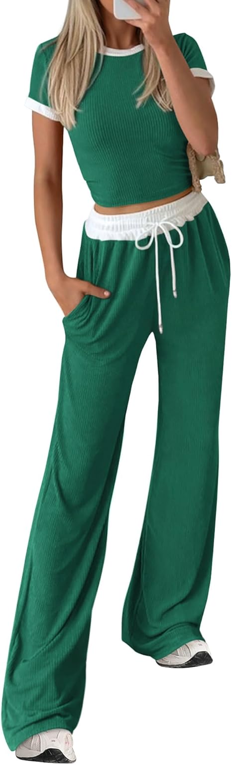 BTFBM Womens 2 Piece Outfits 2025 Spring Fashion Casual Clothes Ribbed Knit Crop Top Wide Leg Pants Tracksuit Lounge Set