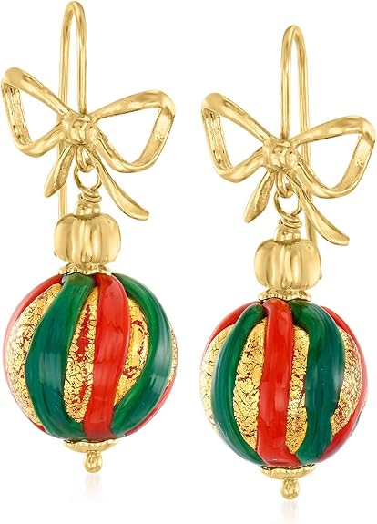 Ross-Simons Italian Multicolored Murano Glass Christmas Ornament Bead Drop Earrings in 18kt Gold Over Sterling