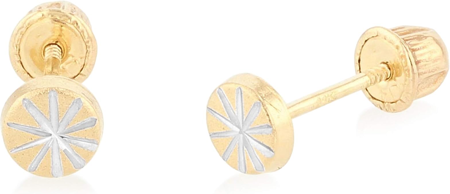 14K Two Tone Gold Diamond Cut Circle Screw Back Stud Earrings