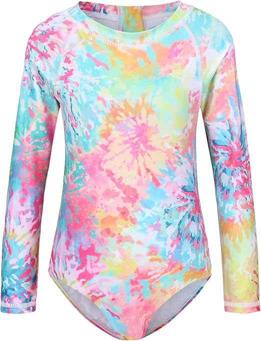 Girls Long Sleeve Rash Guard One Piece Swimsuits for Kids Tie Dye Bathing Suit UPF 50+ Swim Shirts 3-16 Years