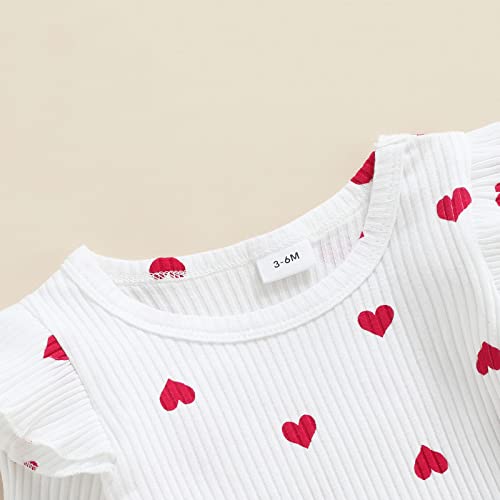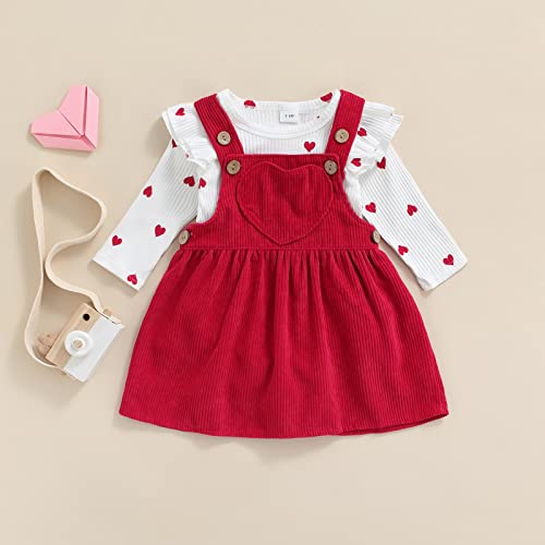 RSRZRCJ Newborn Baby Girl Valentines Day Outfit Long Sleeve Heart Print Bodysuit Romper Top Suspender Overall Skirt 2PCS Set (Ruffle White+Red, 6-9 Months)