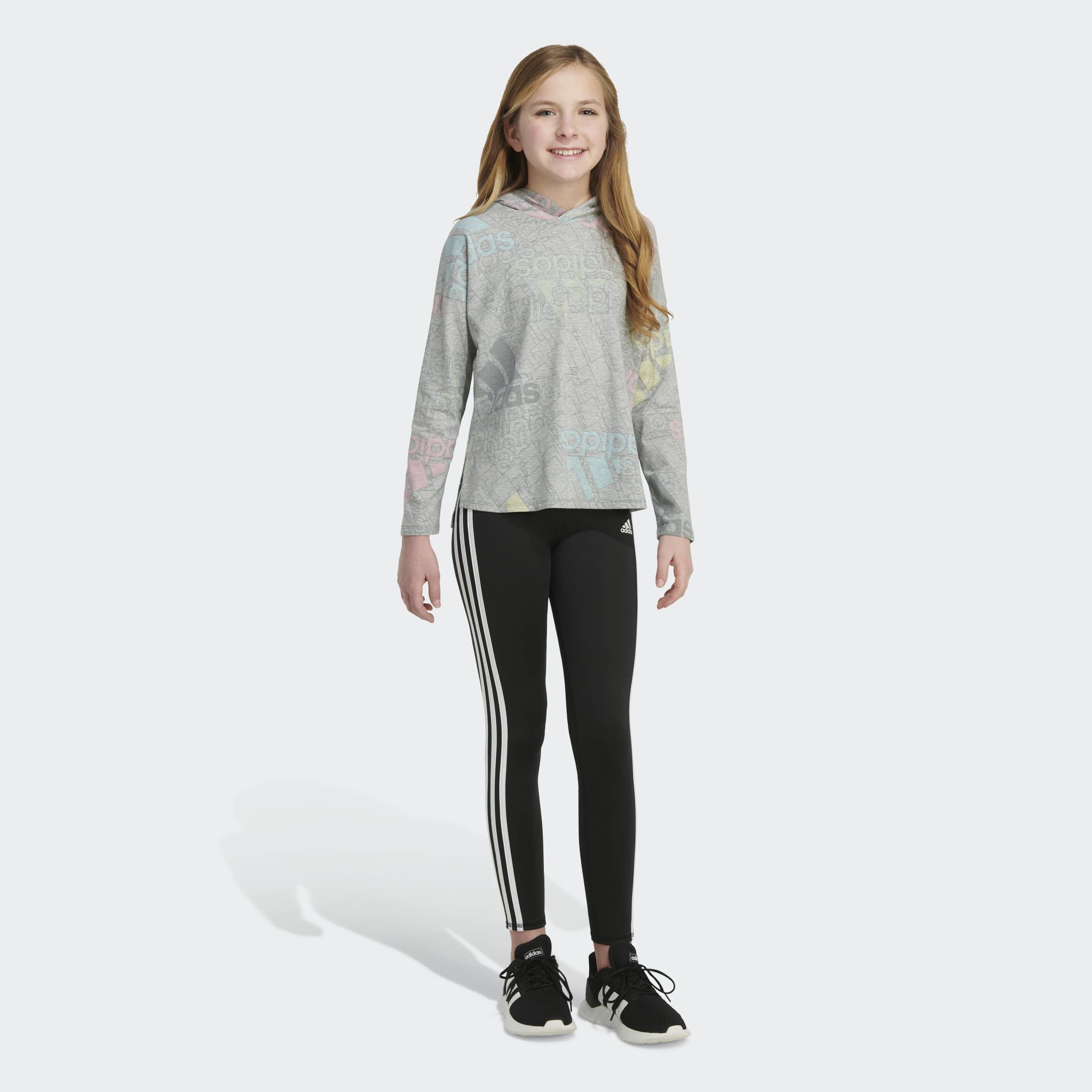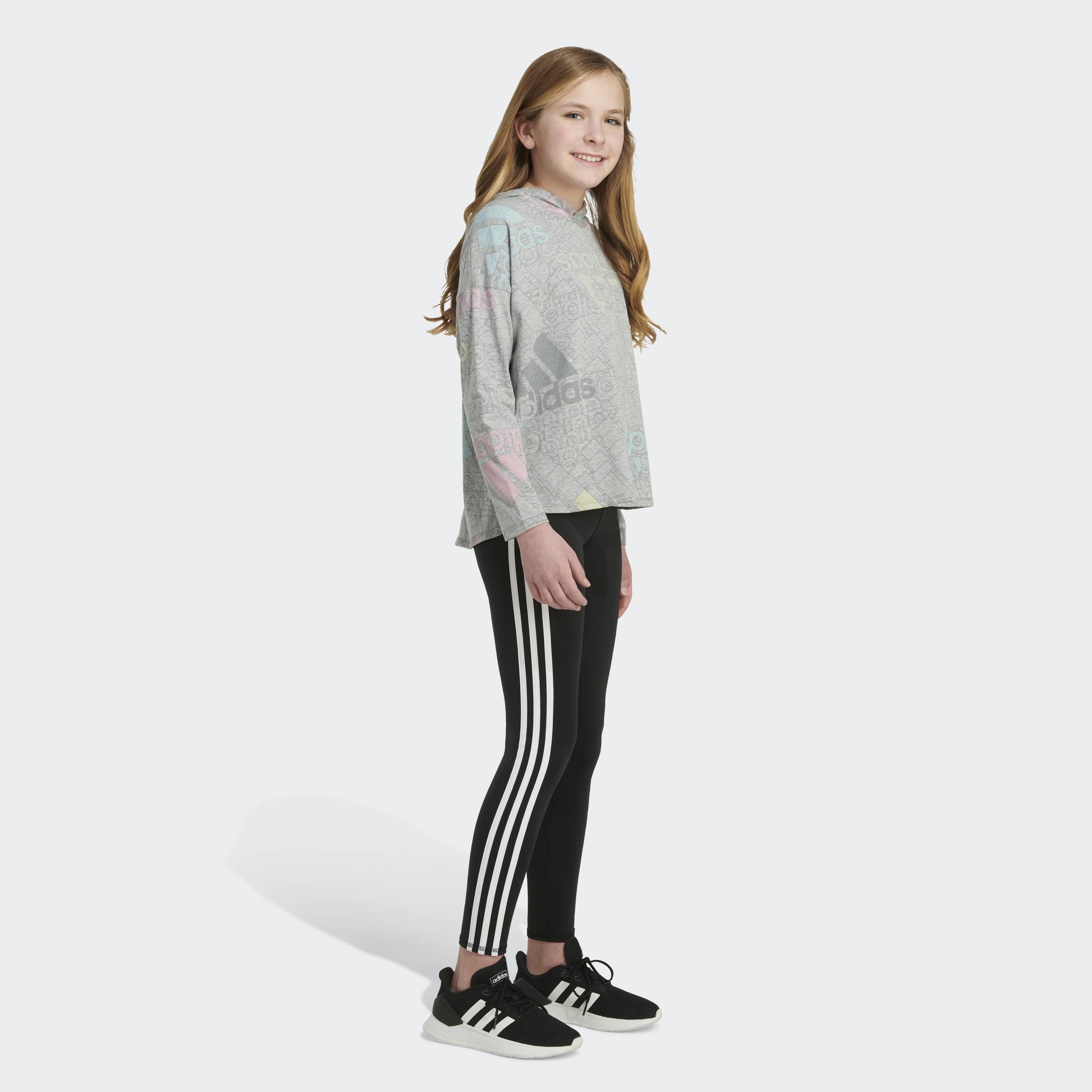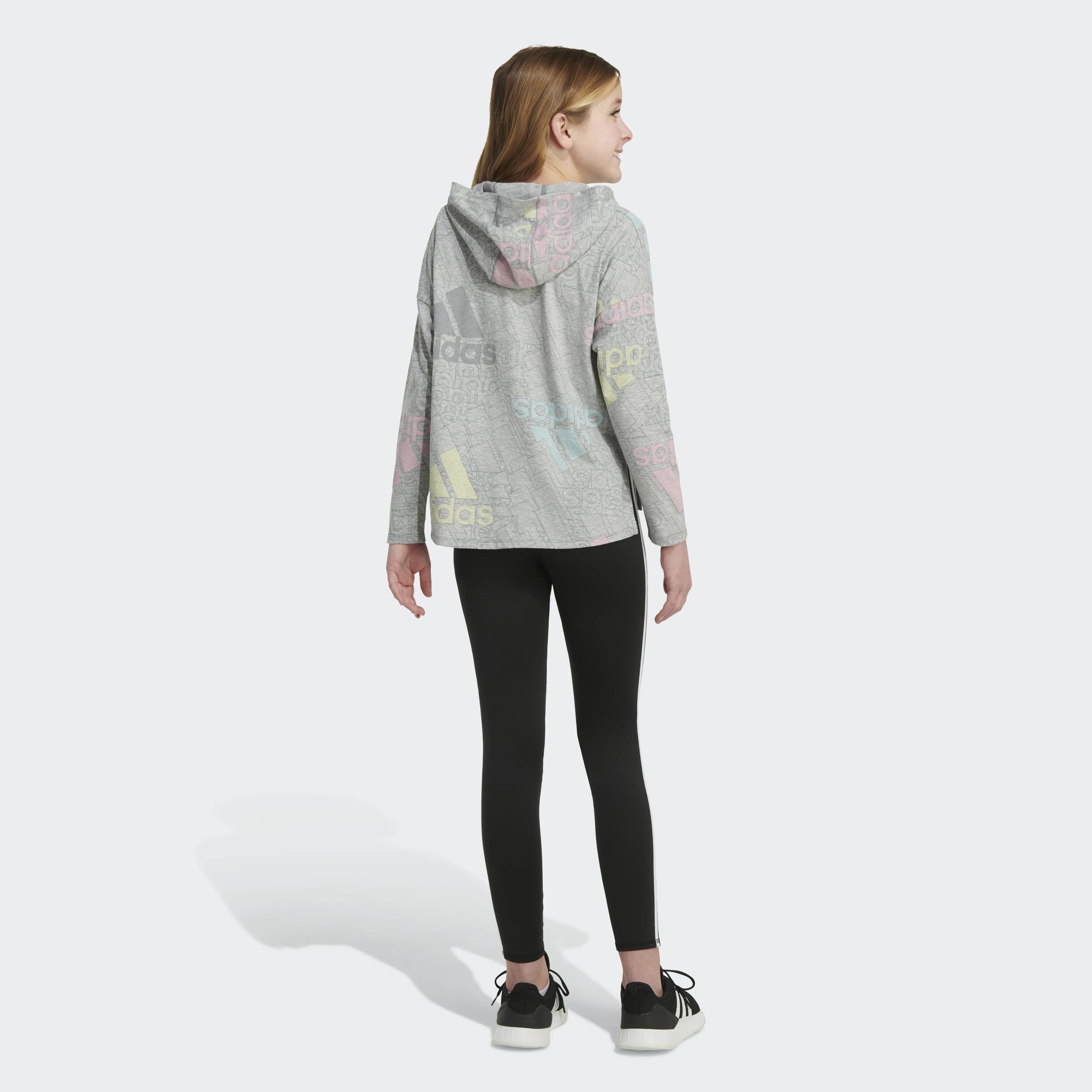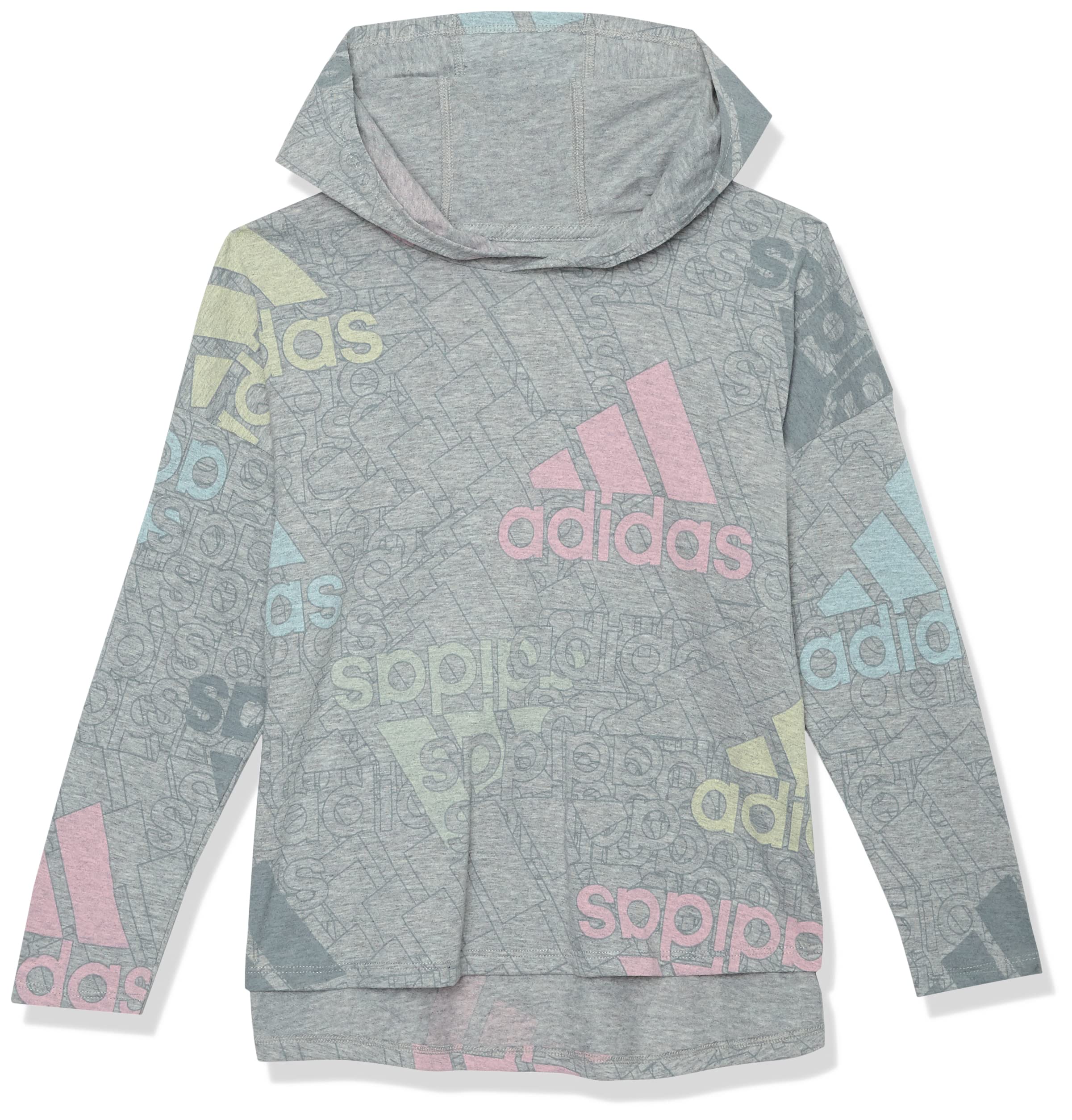 adidas Girls' Long Sleeve Hooded Graphic Tee, Grey Heather with Multicolor, Medium (10/12)