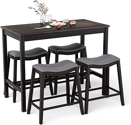 Giantex Dining Table Set for 4, Kitchen Counter Height Table w/ 4 Stools, 5 Piece Bistro Table Set, Rubber Wood Pub Dinette Set w/Upholstered Stools, Space-Saving Table Set for Small Spaces (Black)