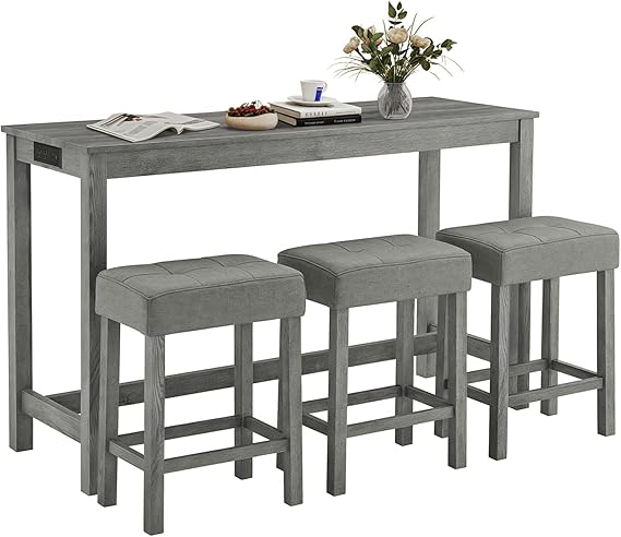 Kitchen Bar Table and Chairs Set, 4 Piece Bar Height Dining Table Set with Power Outlet and 3 Upholstered Stools Industrial Breakfast Nook, Small Space Living Room, Gray