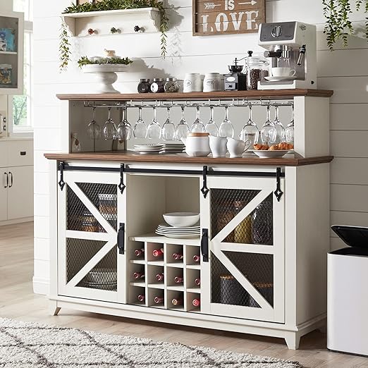 OKD Farmhouse Coffee Bar Cabinet with LED Lights, 55" Wine Bar Cabinet w/Sliding Barn Door & Wine and Glass Rack, Kitchen Buffet Cabinet w/Storage Shelves for Dining Room, Antique White