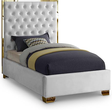 Meridian Furniture Lana Collection Modern | Contemporary Velvet Upholstered Bed with Deep Detailed Tufting and Gold Legs, Twin, White