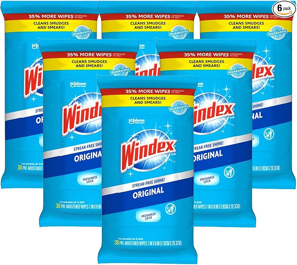 Windex Wipes Glass Cleaning Ammonia Free, Pre-Moistened Glass and Surface Wipes to Clean Home Surfaces, Household Essentials, Original Scent, 38 Count (Pack of 6)