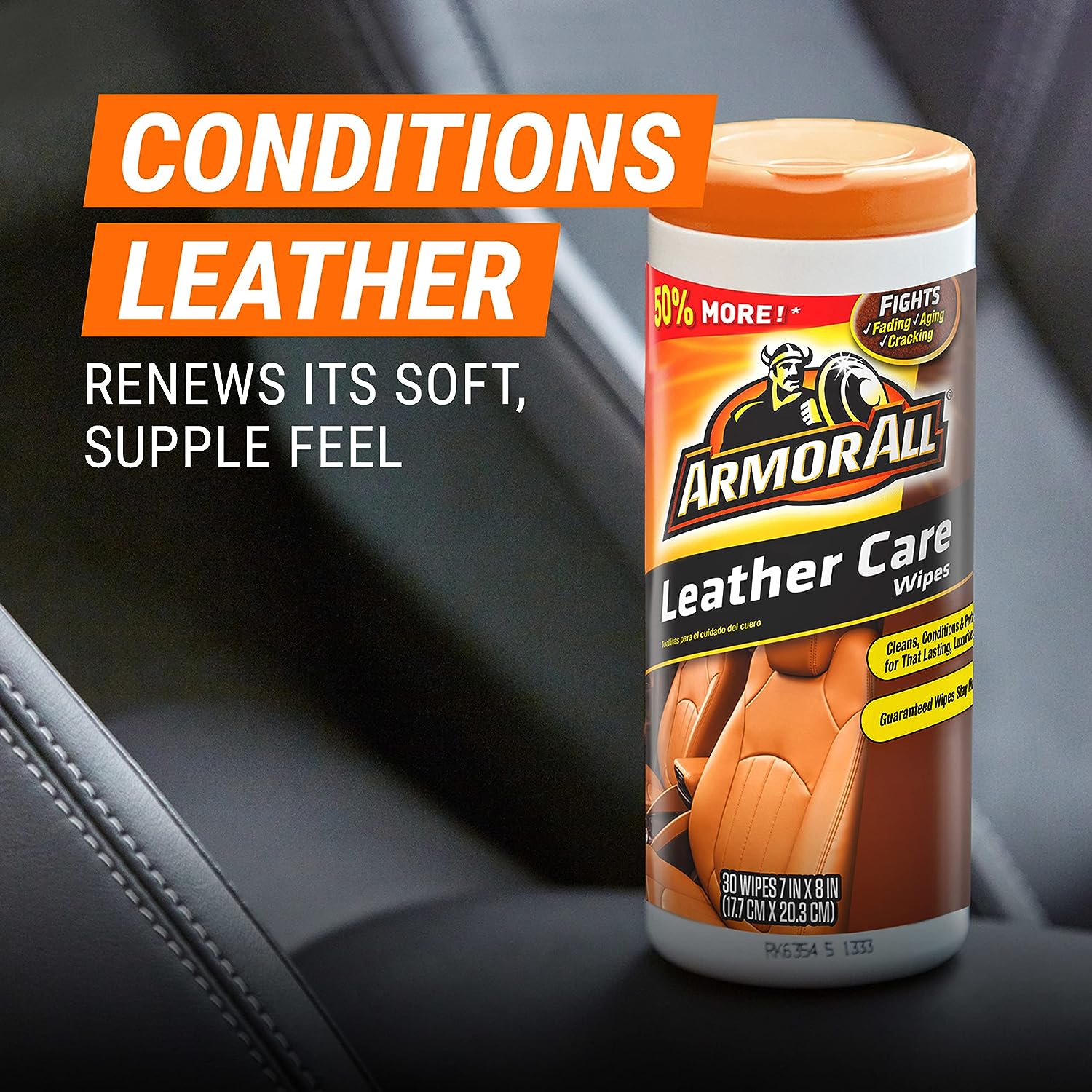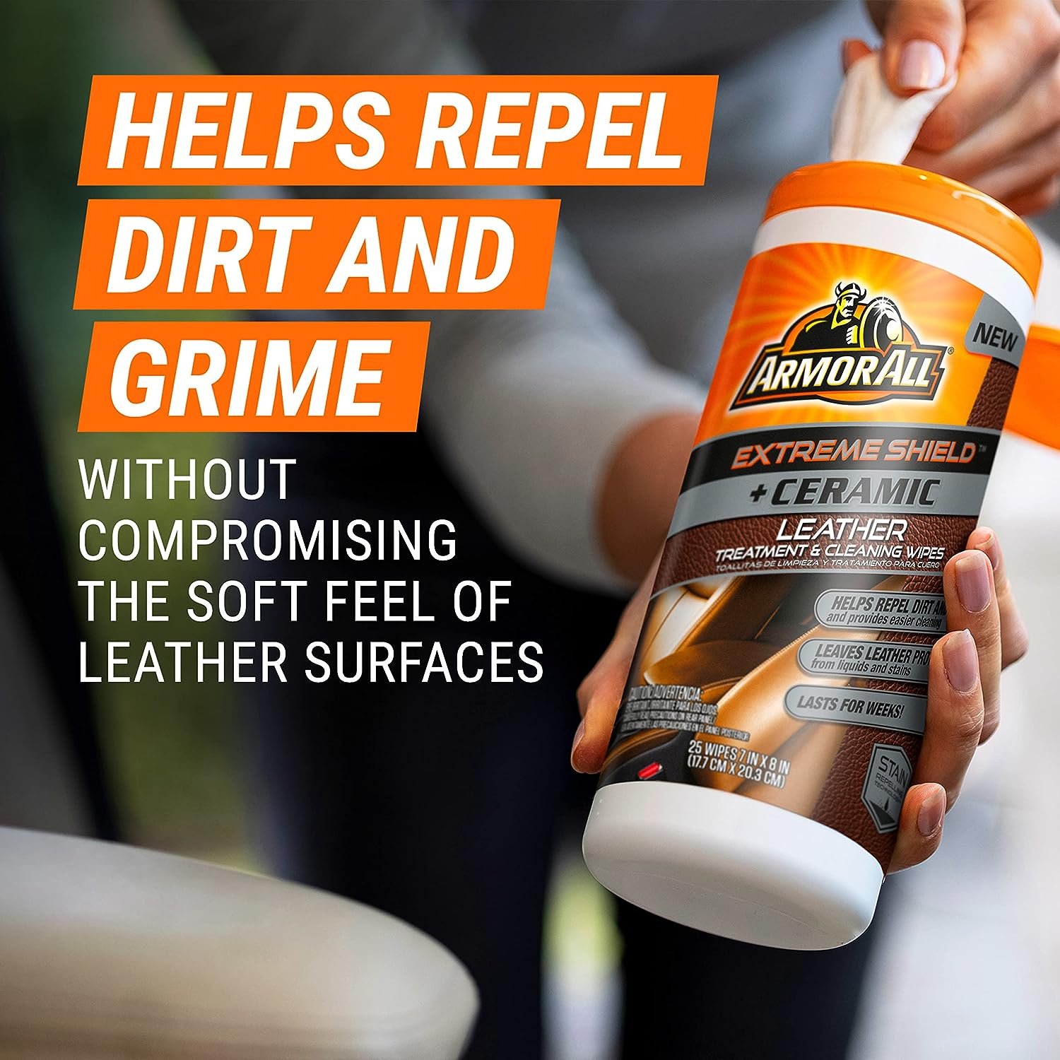Get long-lasting protection for your leather upholstery with Armor All Ceramic Leather Cleaning Wipes. The car upholstery cleaner uses premium technology that creates an invisible Ceramic barrier to repel dirt, grime and stains without compromising the look and feel of your leather. UV blockers in these car leather wipes protect and maintain leather. This leather treatment also provides a non-greasy look and feel. These dye-free leather cleaning wipes are safe for heated seats, perforated leather surfaces and leather of any color. Help keep your car looking and feeling like new with Armor All.