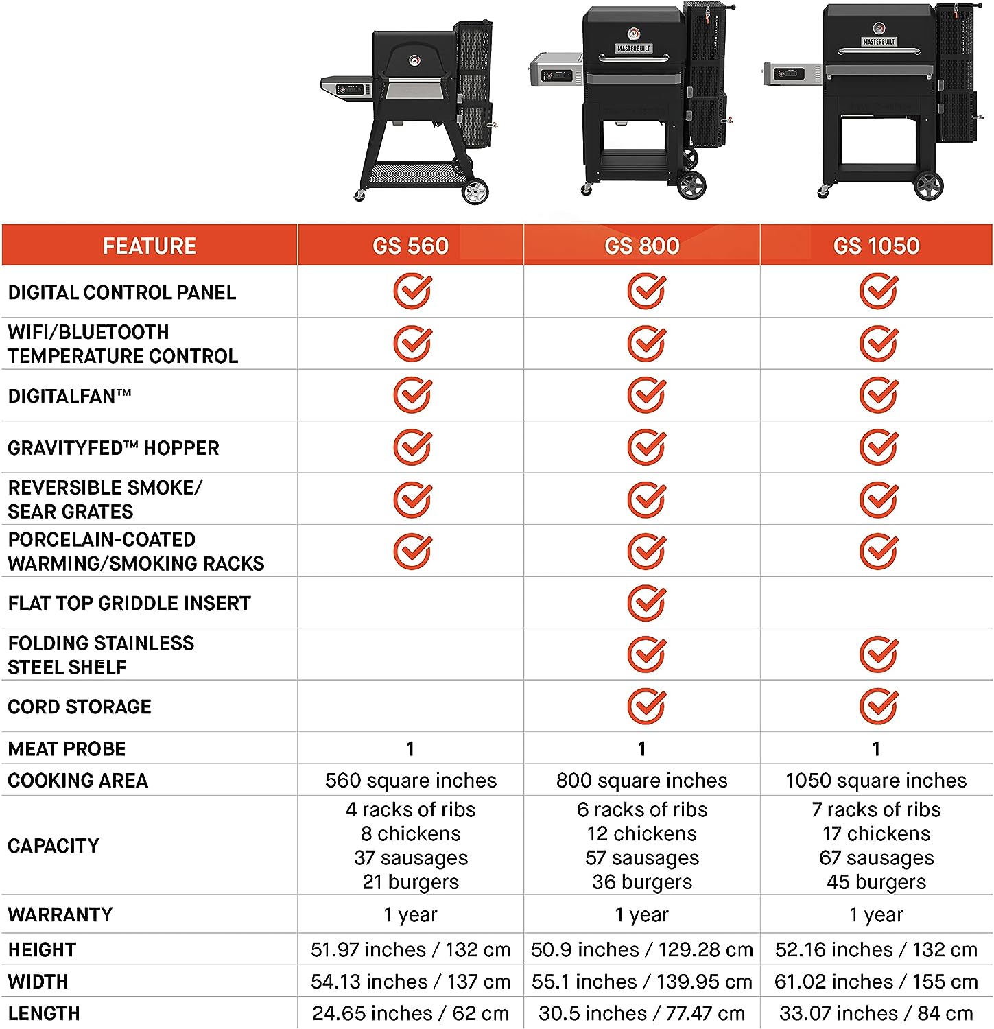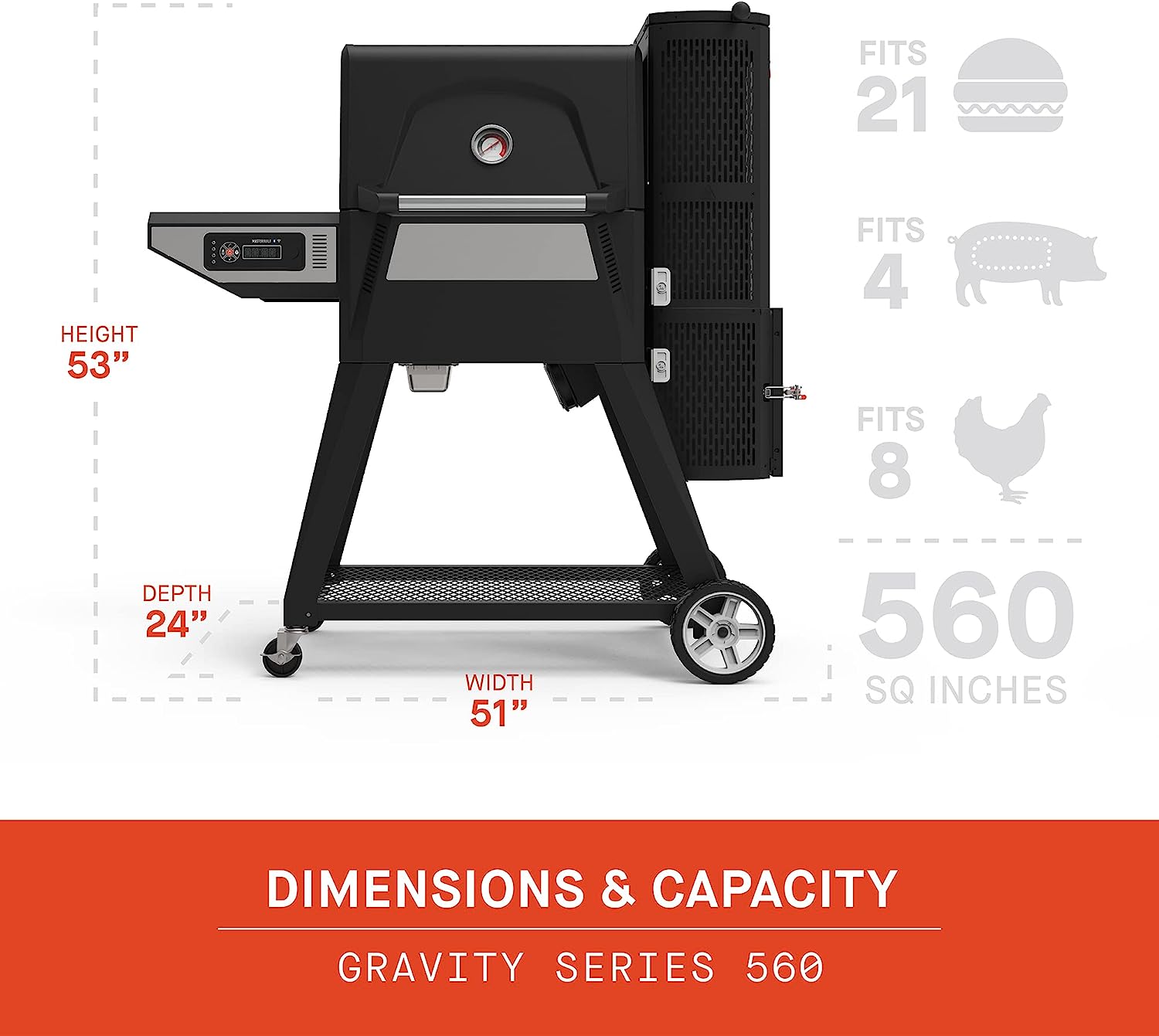 • Two porcelain-coated warming/smoking racks for 560 total square inches of cooking space